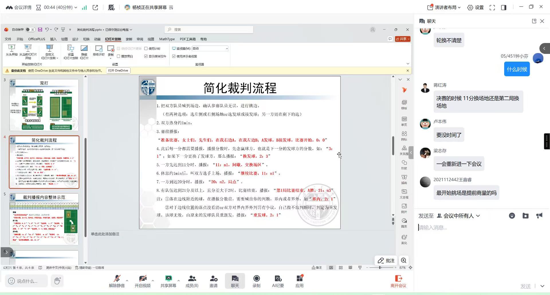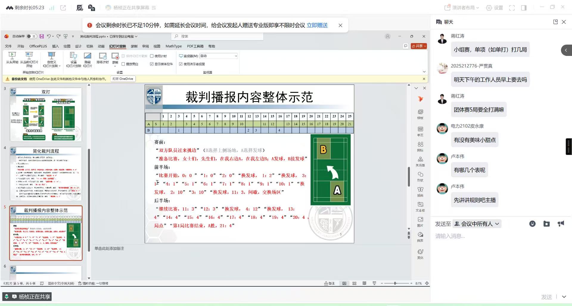 培训聚焦赛事核心需求,分模块开展教学。在规则培训环节,主讲人详细解读羽毛球单打、双打竞赛规则,重点说明发球规范、得分判定、违例情形等关键要点;随后围绕简易裁判流程,讲解判罚原则、信号示意等实操内容;最后明确赛事中记分员、捡球员、场务人员等不同岗位的职责分工,强调协作配合要点。
