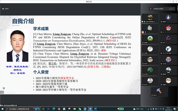 为扎实有效提升支部成员学术科研热情,在有效提升党建质量和党员理论素养的同时注重培养研究生的科研能力。2022年6月19日,电气工程学院硕士2021级12班党支部有幸邀请到硕士2020级国奖获得者梁宗佑同志,以线上形式举办学习科研分享会,活动由党支部书记严一舟同志主持。
