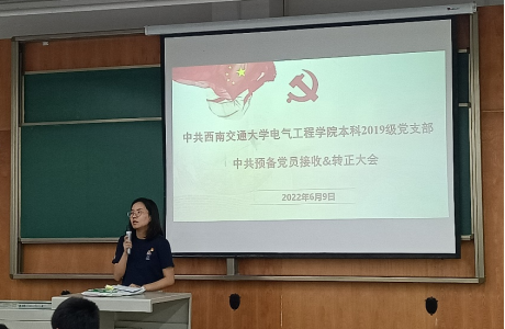 2022年6月9日下午14时30分,中共西南交通大学电气工程学院本科2019级党支部中共预备党员接收以及转正大会在X4115成功举行。本次支部大会由詹睿老师主持,共接收26名同志为中共预备党员,10名同志转正为中共正式党员。