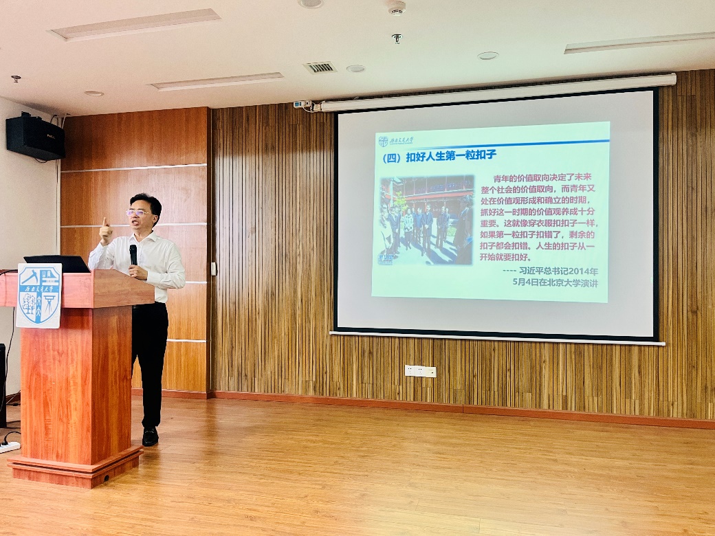 在课程中,张学龙通过对典型警示案例的解读,分享自己的人生体会。法网恢恢,疏而不漏,他提醒同学们要戒除侥幸心理,不要为了金钱和权力触碰底线,要算好“政治、经济、名誉、亲情、自由”这五笔“人生账”,警示同学们“珍惜信任、珍惜声誉、珍惜当下,不要让自己的一切毁于一旦”。他指出成功的人首先要善于思考,学会倾听、接纳他人的意见,努力提高自身的品性修养、工作能力,因个人品质的“贵”而赢得组织的信任,心胸宽广,格局大气,努力把每件事情变成自我突破的机会,但行好事,莫问前程。