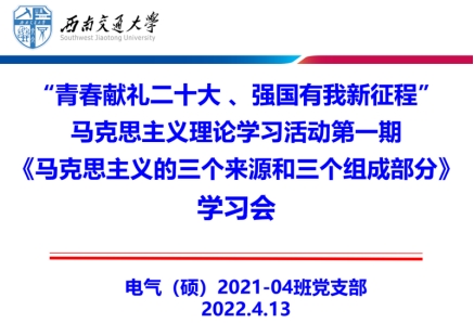 为深入学习贯彻习近平新时代中国特色社会主义思想,教育引导支部成员感悟马克思主义的真理力量和实践力量,坚持“悟思想”达到入脑入心,电气工程学院硕士2021级第四党支部于4月13日在犀浦校区X4157面向支部全体党员和班级其他同学开展了第一期马克思主义理论学习活动——《马克思主义的三个来源和三个组成部分》学习会