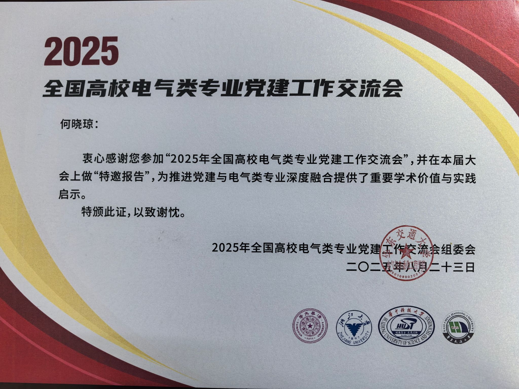2025年8月23-24日,全国高校电气类党建双创协同平台成立大会暨电气专业党支部书记双带头人能力提升论坛在江西南昌召开。国家轨道交通电气化与自动化工程技术研究中心党支部书记何晓琼受邀参会,并做大会特邀报告。电气工程学院党委副书记王轶、电力工程系教师党支部书记刘炜同时参会。