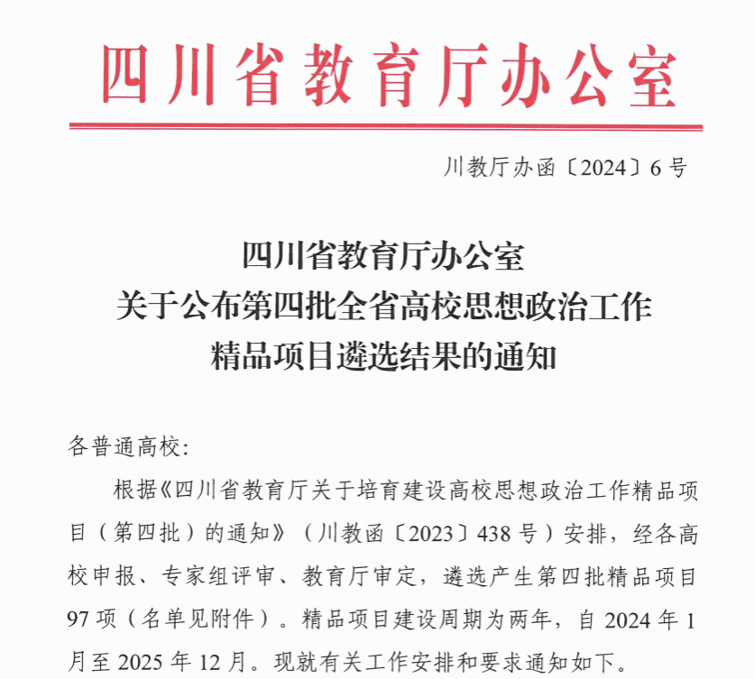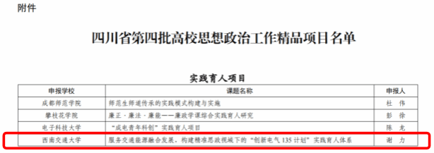 根据《四川省教育厅关于培育建设高校思想政治工作精品项目(第四批)的通知》(川教函〔2023〕438号)要求,经学校推荐、专家组评审、教育厅审定等程序,我院申报的《服务交通能源融合发展,构建精准思政视域下的“创新电气135计划”实践育人体系》获批立项第四批全省高校思想政治工作精品项目。