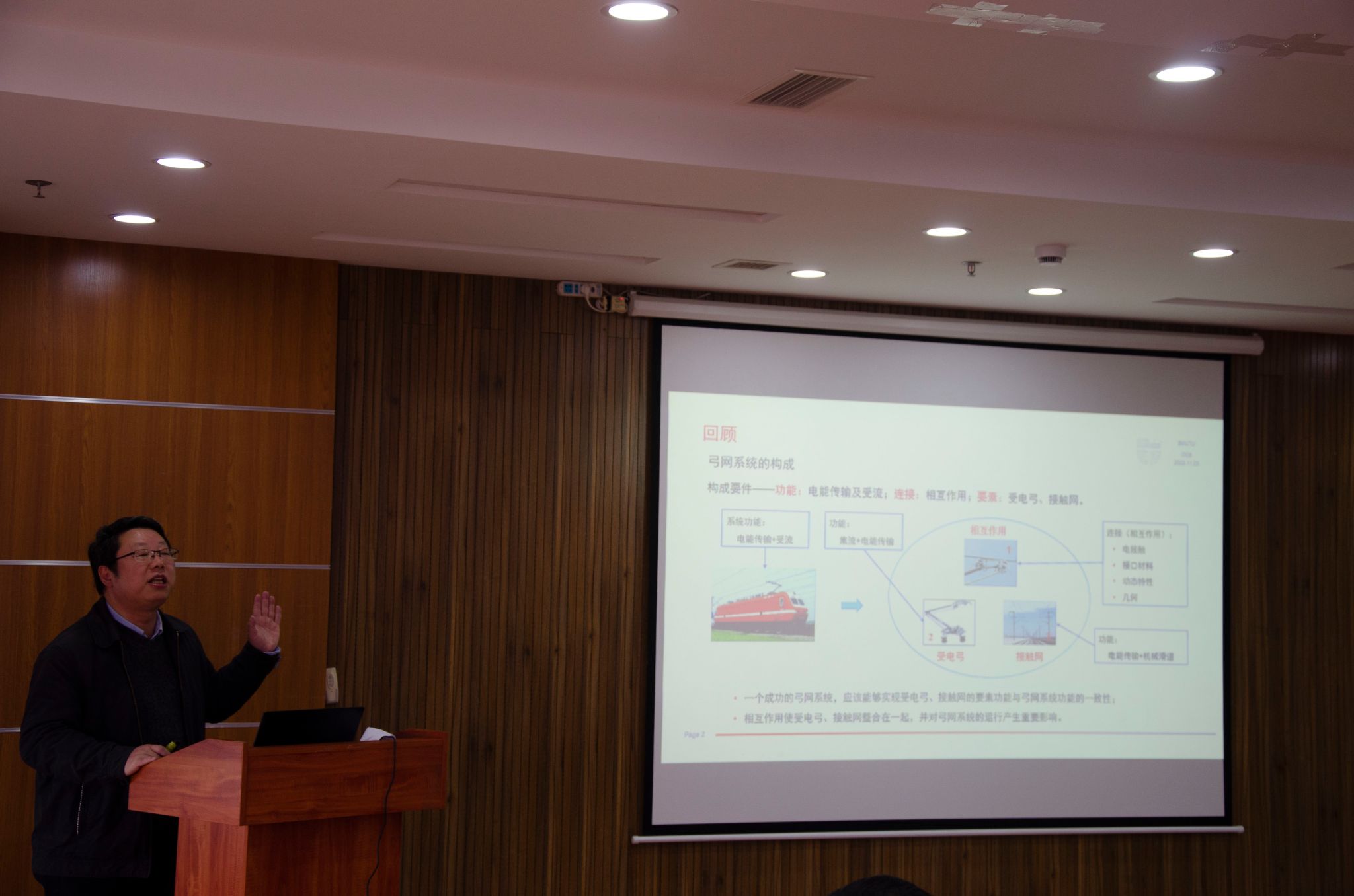 吴积钦教授以《弓网电接触》示范课为例,与在座教师分享了先进教学理念和教学技巧。例如,利用有趣的语言调节学生上课的气氛、联系生活巧妙解答疑难问题、图文结合提出问题、利用问题引出挑战性课题,这些都是十分巧妙的办法。吴积钦教授强调,青年教师应学会换位思考,充分考虑学生感受,适时提出思政教育。他从人才的问题引出人在学习中如何进步、人的目的性和谋生利益、知识与文化的区别等思考,进一步提出让人理解、为学生考虑、认知与思维的重要性。在最后的结语中提出有教无类、因材施教、教学相长等要点。