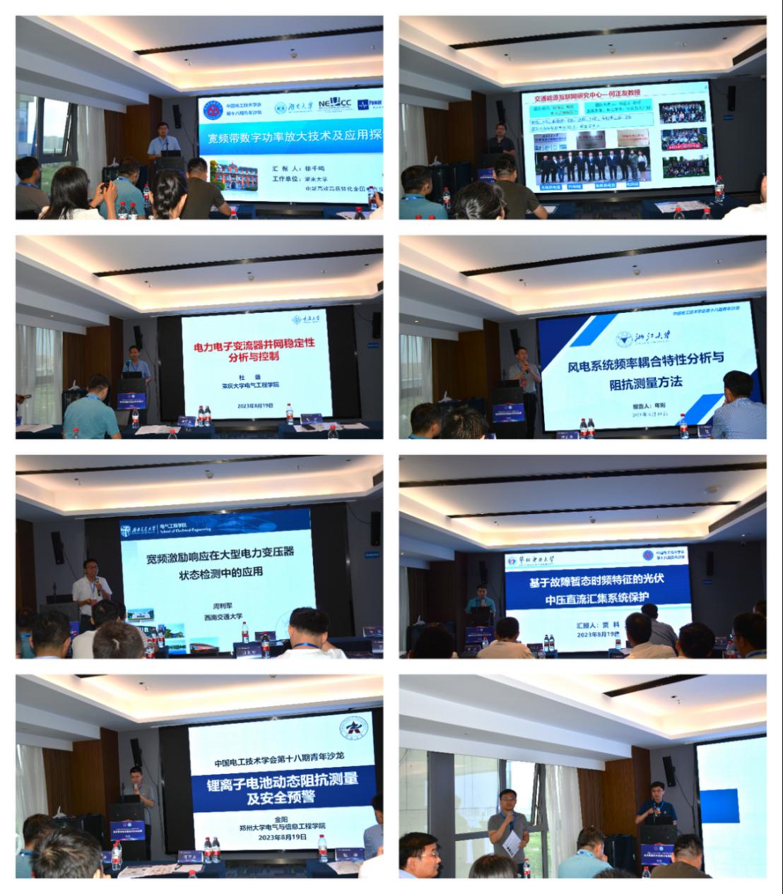 专家报告环节由西南交通大学胡海涛教授、湖南大学徐千鸣教授和西南交通大学廖凯副教授分别主持,特邀8位知名专家和青年学者分别进行学术报告:重庆大学杜雄教授作题为“电力电子变流器并网稳定性分析与控制”的报告、浙江大学年珩教授作题为“风电系统频率耦合特性分析与阻抗测量方法”的报告、西南交通大学周利军教授作题为“宽频激励响应在大型电力变压器状态检测中的应用”的报告、华北电力大学贾科教授作题为“基于故障暂态时频特征的光伏中压直流汇集系统保护”的报告、郑州大学金阳教授作题为“锂离子电池动态阻抗测量及安全预警”的报告、上海交通大学吕敬副教授作题为“基于数据驱动的风电并网系统宽频阻抗识别与稳定性在线分析”的报告、湖南大学徐千鸣教授作题为“宽频带数字功率放大技术及应用探讨”的报告、西南交通大学胡海涛教授作题为“高铁车网耦合系统串/并联注入宽频带阻抗测量技术”的报告。8位专家分别从电力系统、新能源发电、继电保护、电力电子、高电压、储能电池等多学科交叉视角分享了阻抗测量技术领域最新的研究进展、技术应用以及目前面临的技术瓶颈与挑战。