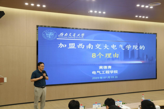 院长助理黄德青教授作报告。黄德青教授首先向同学们介绍了自己的求学历程,分享了自己的人生格言。随后阐述了选择西南交通大学电气工程学院的八个理由,希望同学们来到西南交通大学电气工程学院攻读研究生。最后,黄德青教授寄语同学们能够万事如愿,当遇到挫折时,一定要坚强勇敢。
