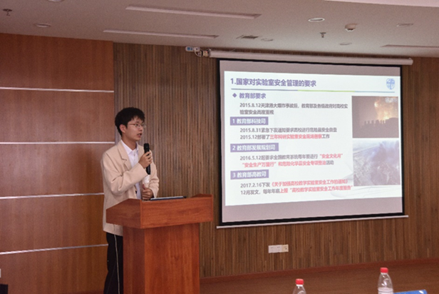 最后,由西南交通大学实验室安全大使团成员龚锦杰(信息科学与技术学院)介绍学校实验室安全管理相关知识。龚锦杰通过从“国家对实验室安全工作的要求”、“我校实验室安全管理工作”、“我校实验室安全教育宣传活动”三个方面进行讲解,重点介绍了教育部检查指标、危险化学品及特种设备的管理。讲解中龚同学通过动画的形式,让大家更加容易了解实验室安全的知识。他还介绍了学校实验室安全大使团,呼吁同学能够积极参加,让师生一起携手共建和谐平安校园。