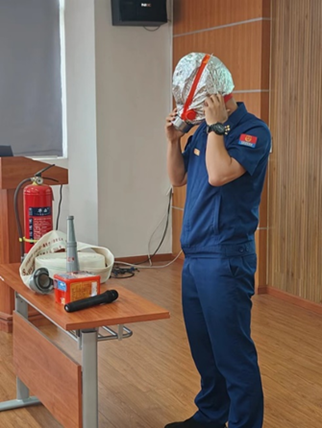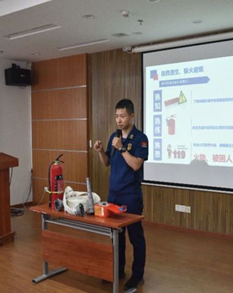 接着,郫都消防大队彭雄从《自救逃生,躲火避烟》展开了本次安全培训。首先通过播放视频案例强调消防安全的重要性,再有就是通过自身在火场的真实情况和感受来告诉大家,躲火的重点在于避烟。如何有效开展自救逃生?要做到熟知环境、熟练使用消防器材、熟悉火灾报警内容,彭教官通过亲身演示如何穿戴防毒面具、如何使用灭火器、如何使用消防栓等器材等方面的知识,让师生更直观学习到了防火知识。如何有效躲火避烟?彭教官通过案例的对比,播放视频,以及自身经验总结出小火快跑、浓烟关门等自救方法。在讲解心肺复苏相关知识的过程中,通过专家的视频以及彭教官自身的经历告之大家相应的知识,让同学们印象深刻。最后教官告诫师生:“安全无小事。”希望大家都能够提高消防意识、注意消防安全。