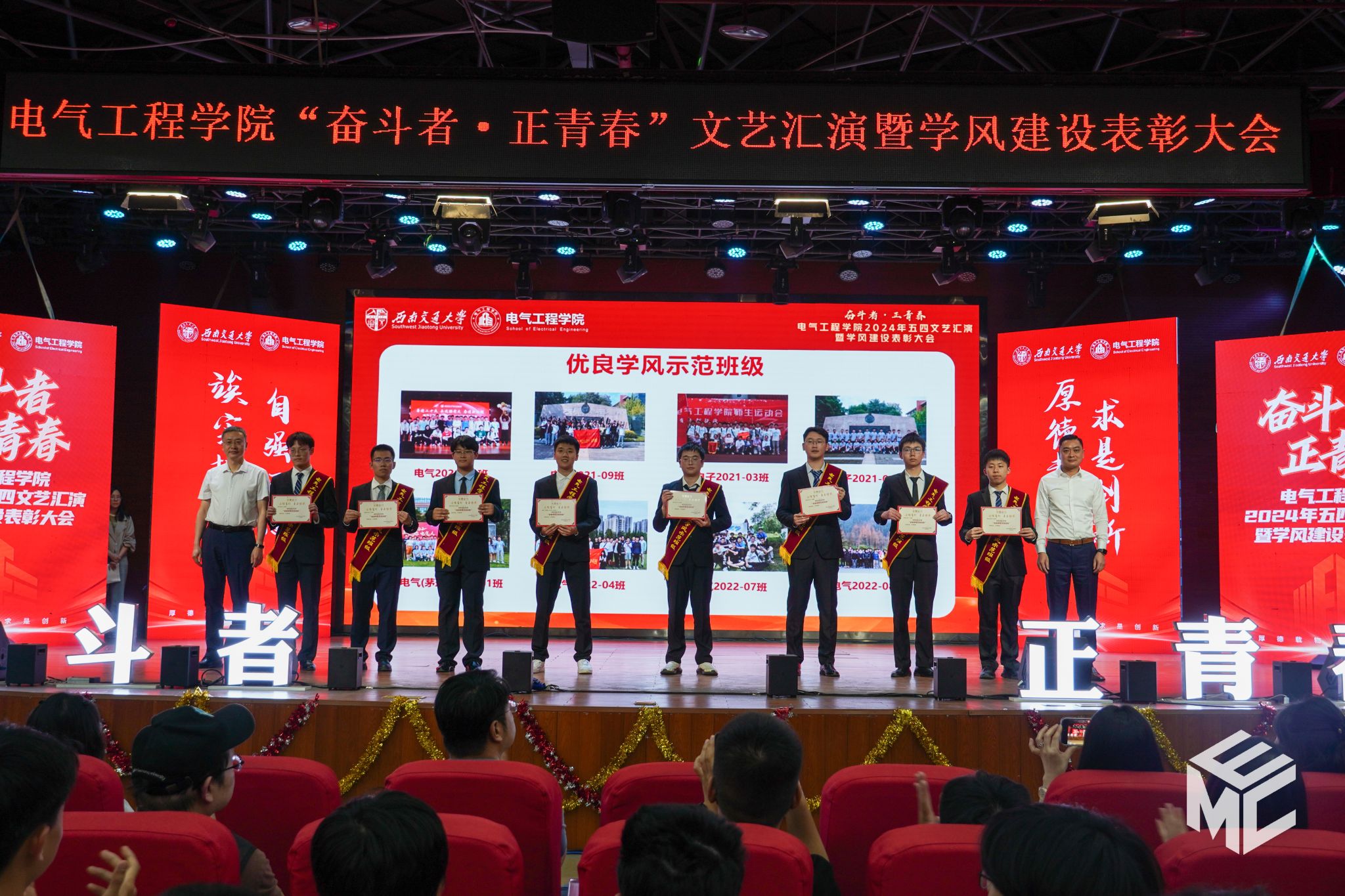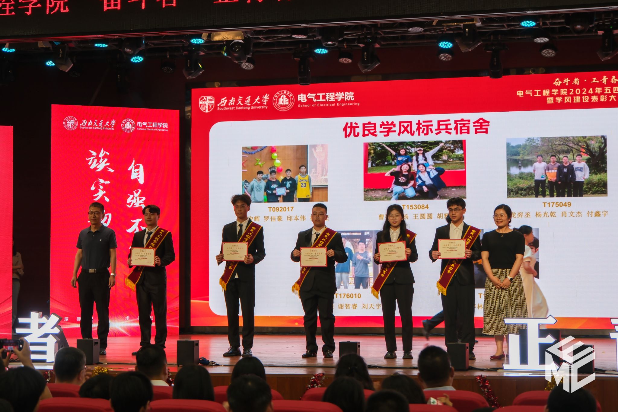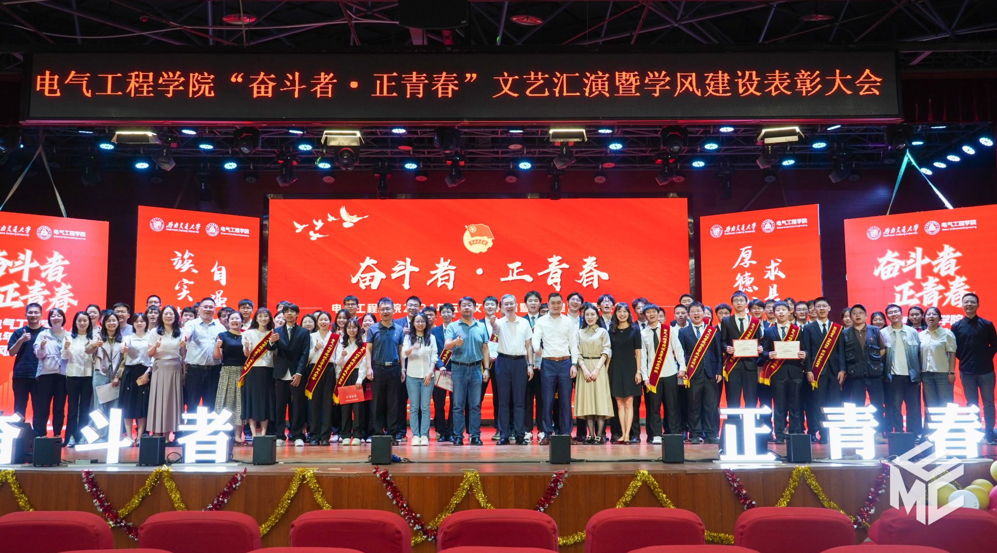 2024年4月27日晚,电气工程学院“奋斗者•正青春”2024年五四文艺汇演暨学风建设表彰大会在犀浦校区大学生活动中心如期举行。西南交通大学团委书记武俊,党委学生工作部副部长邢晓鹏,教务处副处长刘鎏,招生就业处对外联络科科长董鹏飞,电气工程学院党委书记王斌,副院长解绍锋,学院党委副书记谢力、王轶,信承瑞技术有限公司总裁金良赞,信承瑞周钗妹千万光彩基金会理事长林婷婷等出席晚会。2023级班导师及全体辅导员与同学们齐聚一堂,共同参加本次文艺汇演暨表彰大会。