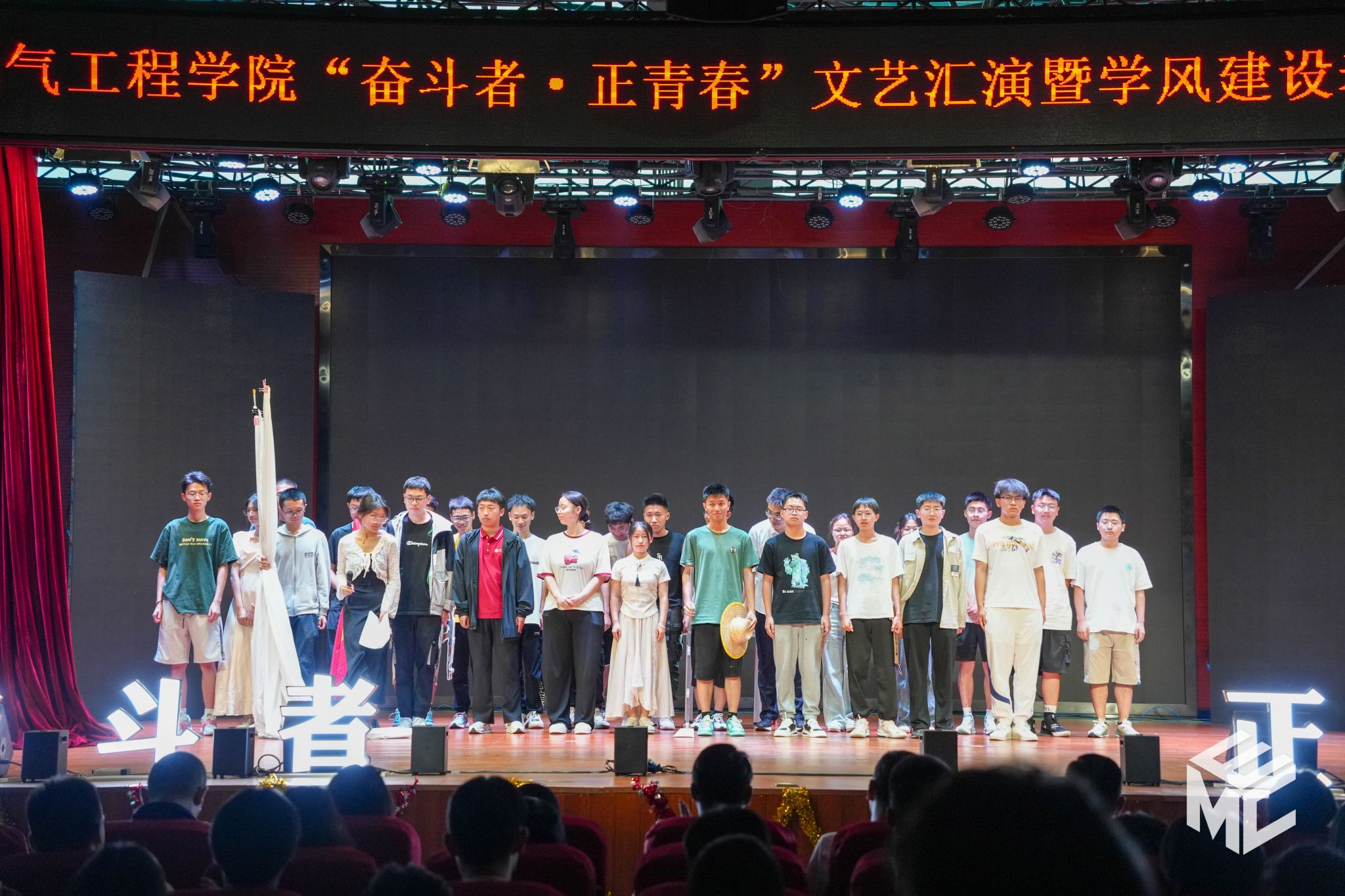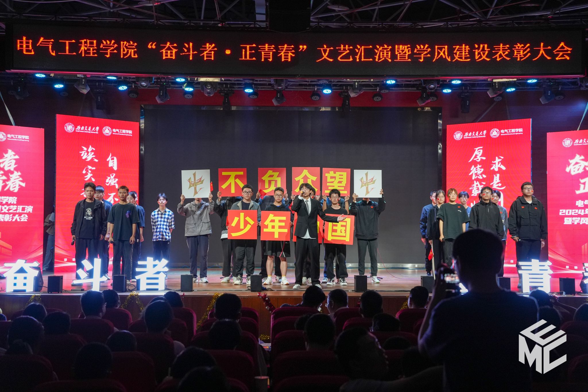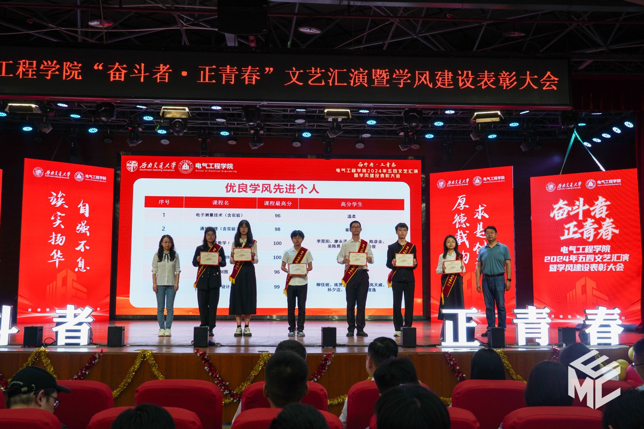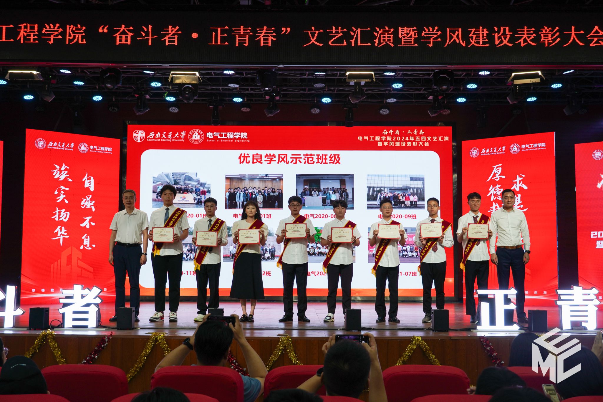 2024年4月27日晚,电气工程学院“奋斗者•正青春”2024年五四文艺汇演暨学风建设表彰大会在犀浦校区大学生活动中心如期举行。西南交通大学团委书记武俊,党委学生工作部副部长邢晓鹏,教务处副处长刘鎏,招生就业处对外联络科科长董鹏飞,电气工程学院党委书记王斌,副院长解绍锋,学院党委副书记谢力、王轶,信承瑞技术有限公司总裁金良赞,信承瑞周钗妹千万光彩基金会理事长林婷婷等出席晚会。2023级班导师及全体辅导员与同学们齐聚一堂,共同参加本次文艺汇演暨表彰大会。