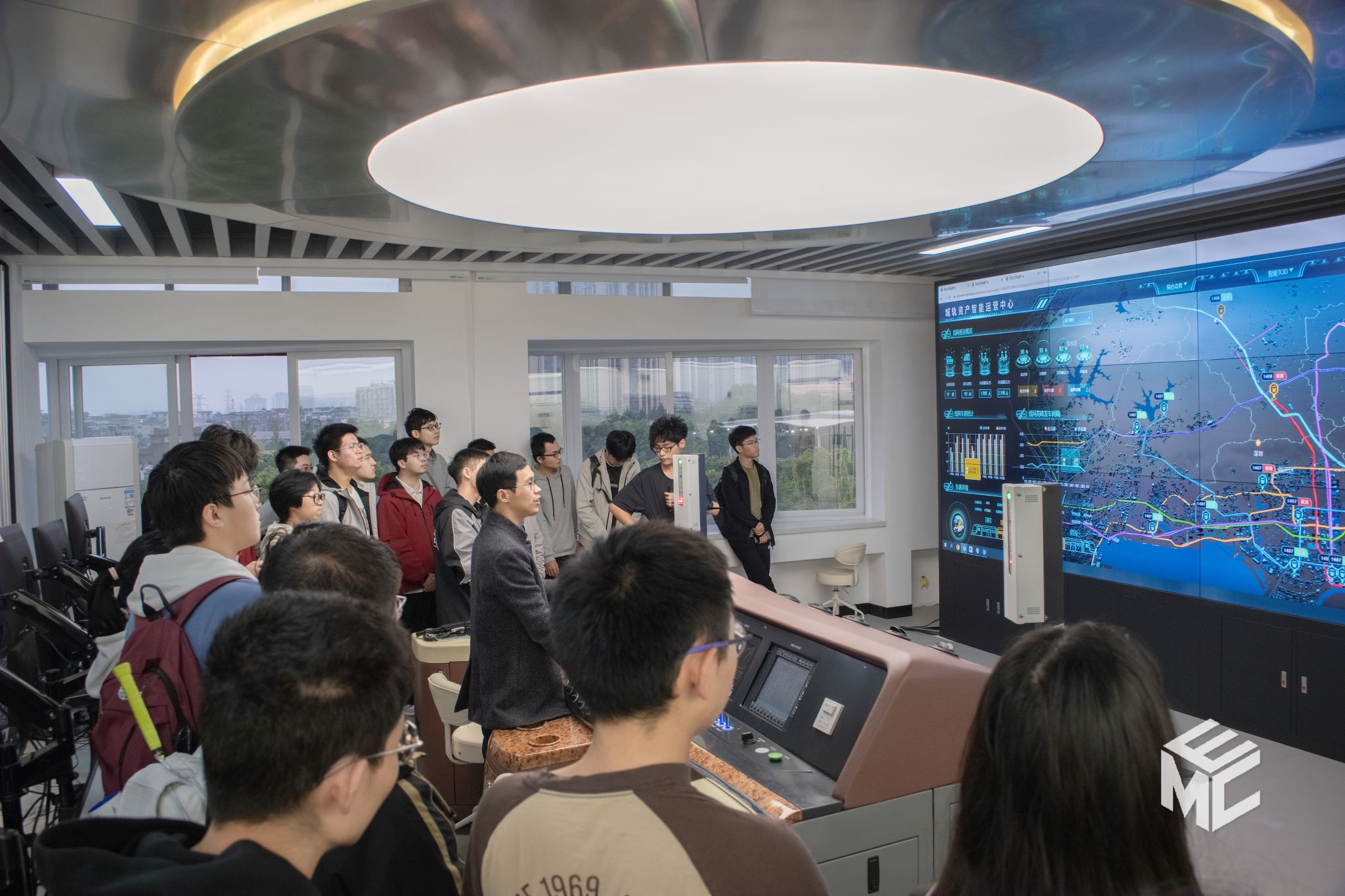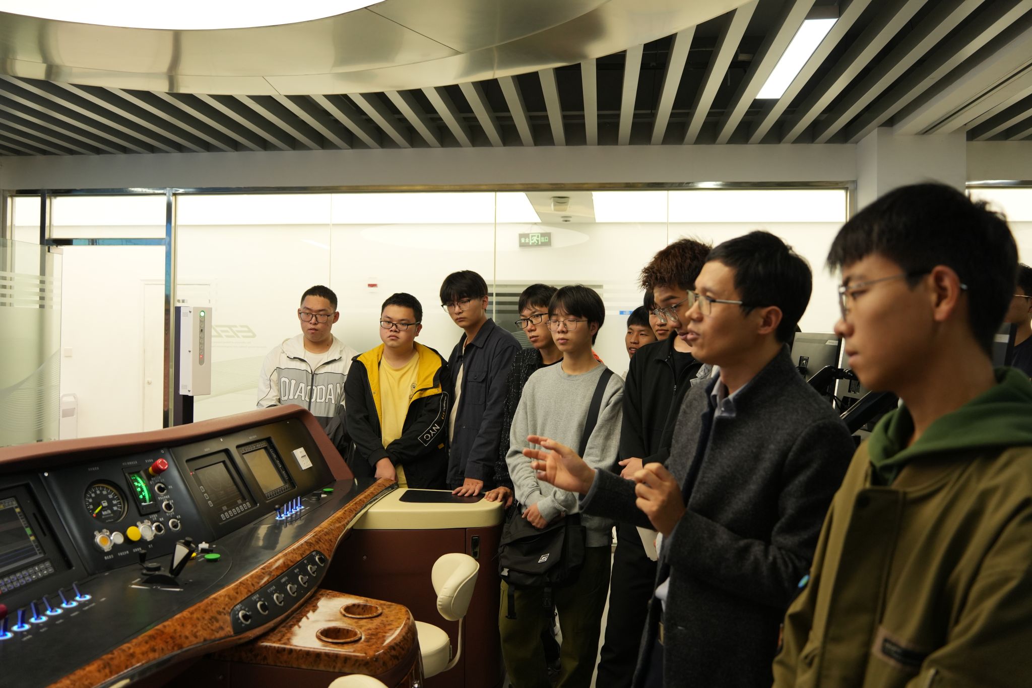 走进列车运行控制实验室,仿佛置身于轨道交通的“大脑“。电气工程学院教授级高级工程师王青元在智慧大屏上为同学们展示了实时变动的列车客流分布情况,以及精准到秒的列车发车时间表。网络平台汇聚海量数据,通过智能分析,可以实现对列车运行的精准预测和协同管控。随后,同学们围绕着机车模拟驾驶台,认真观看王青元老师演示列车操控流程,近距离感受科技赋能带来的便捷与高效。