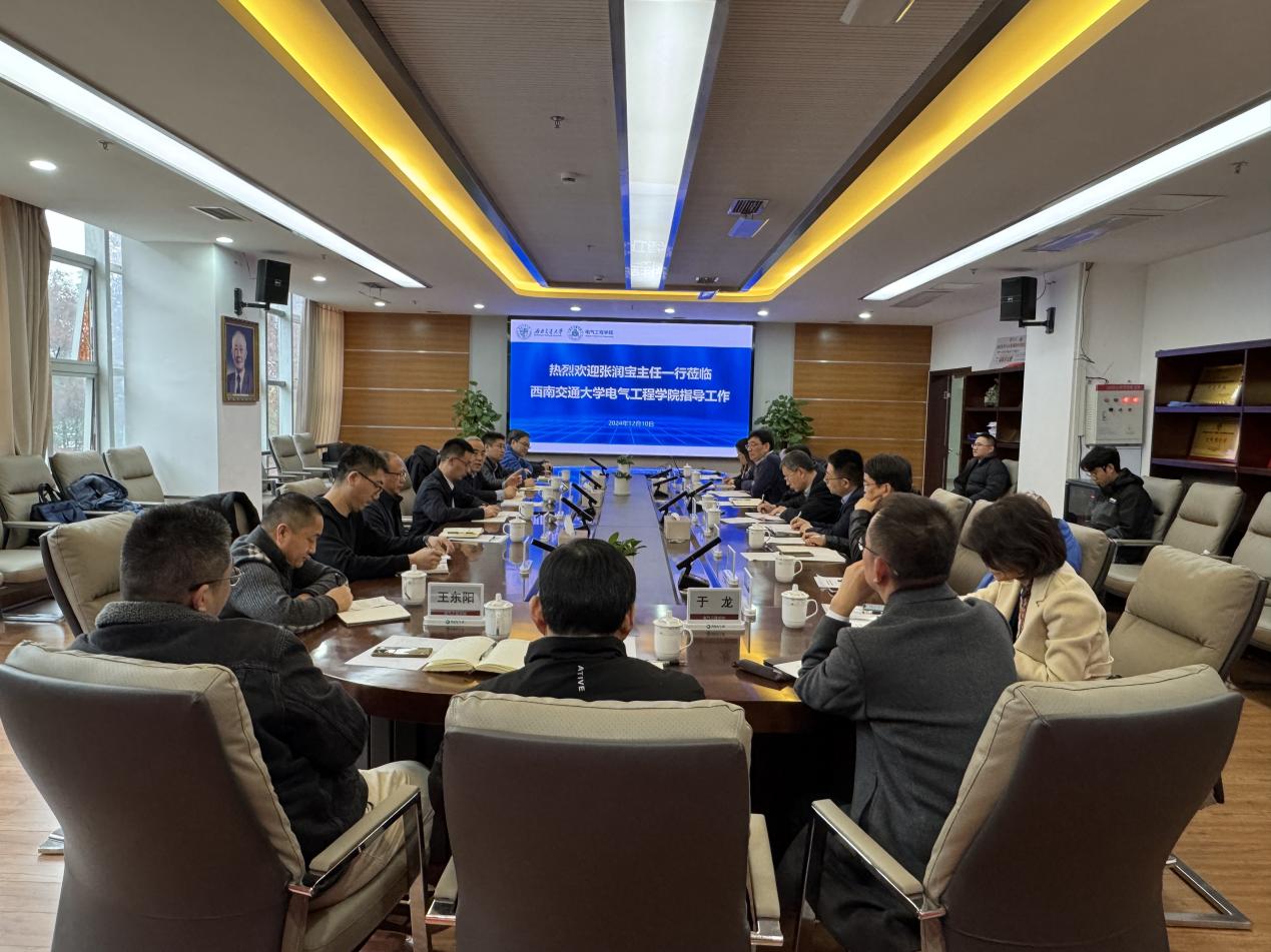 12月10日下午,国铁集团工电部副主任张润宝一行莅临电气工程学院开展交流研讨会。国铁集团工电部主办乔凯庆,中国铁设电化电信院院长罗健,成都铁路局供电处副处长何祥照,中铁二院电化院总工程师邓云川,中国铁设电化电信院电气化所副所长魏建忠;电气工程学院院长马光同,党委书记王斌,国家轨道交通电气化与自动化工程技术研究中心主任高仕斌,继续教育学院院长陈民武,电气工程学院副院长何晓琼、刘志刚,以及学院教师代表参加交流研讨会议。会议由马光同院长主持。