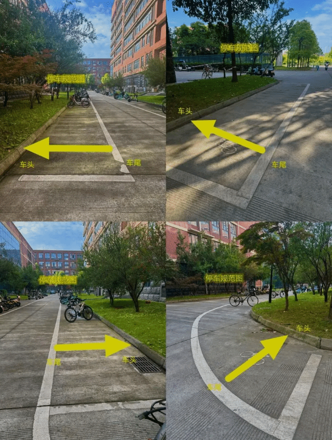若发现不文明停放行为,请友好提醒他人规范停放;若发现通道被堵或车辆倒地,请主动扶正或协助挪移,举手之劳传递校园温情。