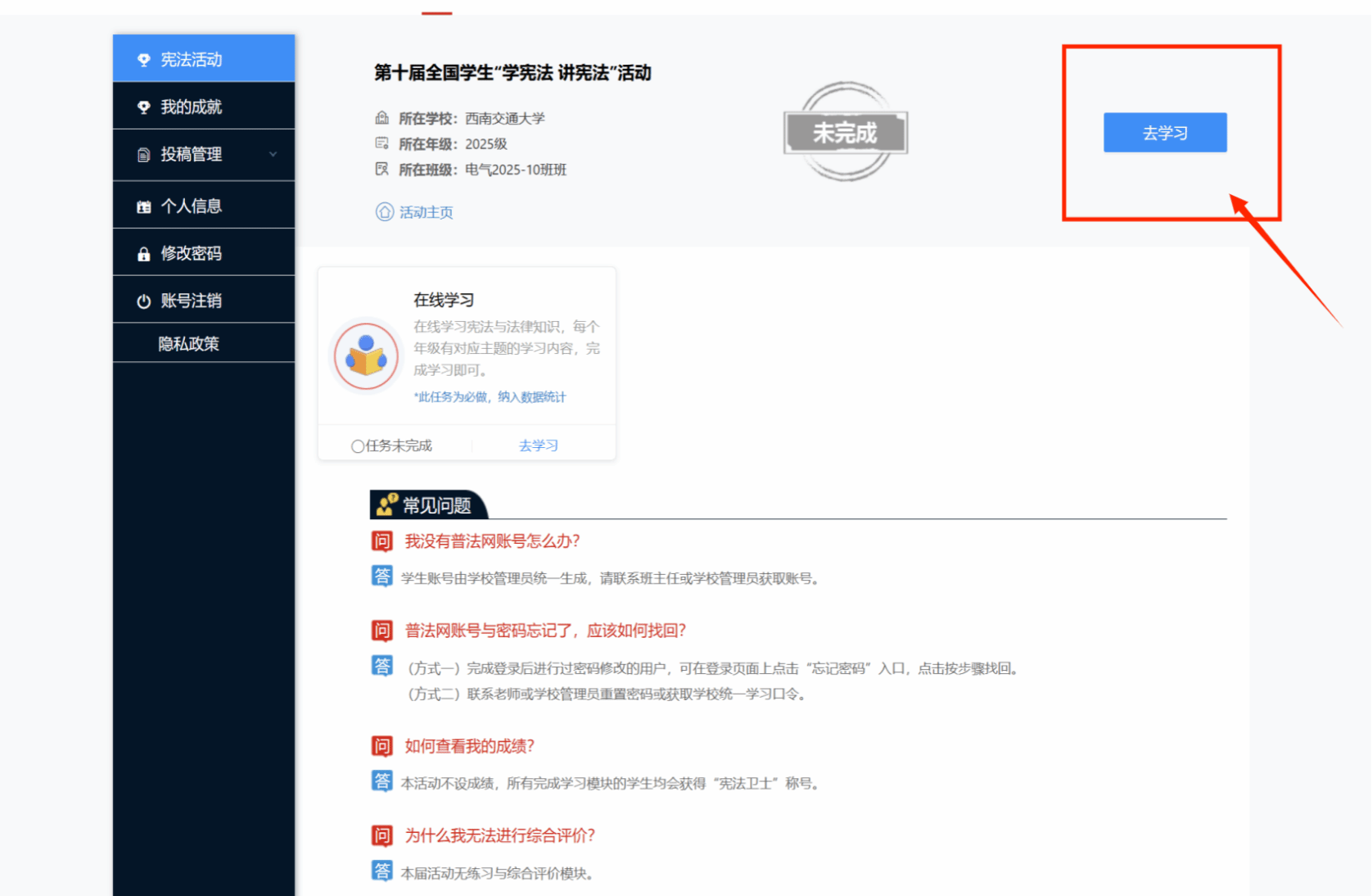 本次学习以年级、班级为单位,统一在教育部全国青少年普法网上开展,各班级应积极组织同学利用平台资源完成在线学习、成果检测等,并于2025年10月26日之前完成平台学习全覆盖。