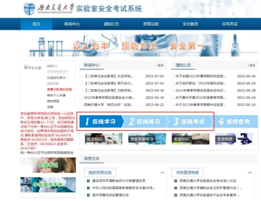 根据教育部办公厅《关于开展加强高校实验室安全专项行动的通知》(教科信厅函[2021]38号)、《西南交通大学实验室安全考试准入办法》(西交校资实〔2020〕4号)的相关要求,在学生进入实验室前,应组织进行专门的实验室安全教育;新生进入实验室的第一堂课,必须讲授实验室安全规则、学生实验守则及实验室安全知识。现就做好学校2022-2023学年第一学期实验室安全教育及实验室安全考试工作,具体要求如下:
