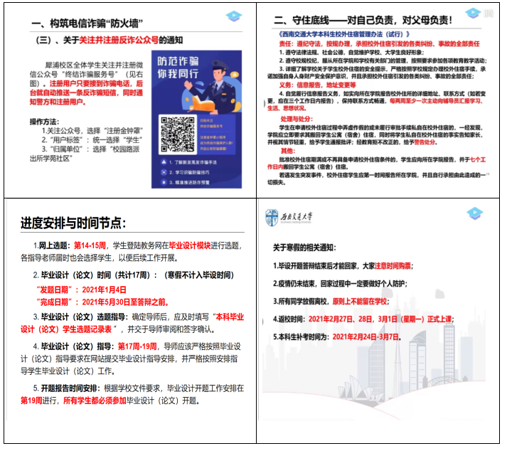 提高防范意识,平安快乐生活。张异带领同学们学习电信诈骗常见案例,分析罪犯常用的诈骗手法。为提高同学们的安全意识,并组织本科2017级全体同学关注并注册反诈公众号。大会临近尾声,随后就近期毕业设计和寒假放假的注意事项做相关通知,提醒同学们注意课设选题和回家购票时间。