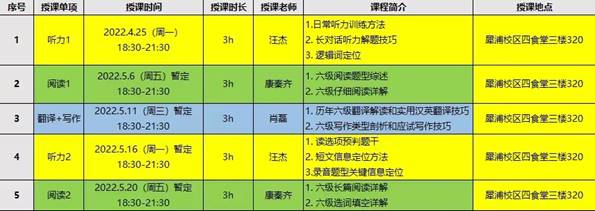 1.培训内容:听力、阅读、翻译、写作,包含所有六级考试内容;