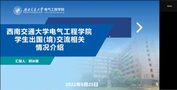 为增强学生对出国留学的认识及规划,进一步开拓学生国际视野,2022年9月25日晚7点整,西南交通大学电气工程学院在线上召开了“学在电气”留学项目推介专题讲座,学院国际人才班班主任郭冰倩对学生出国(境)相关的情况进行了介绍,电气工程学院国际人才班同学参加讲座。