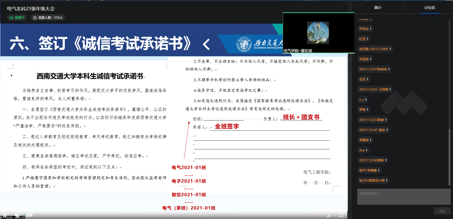 最后,辅导员老师再一次带领各位同学学习了《西南交通大学本科生考试违规处理办法》,并举了相应实例以警醒同学们要诚信考试,展现交大学子的优良校风。同时组织了在校同学签署《西南交通大学本科生诚信考试承诺书》。