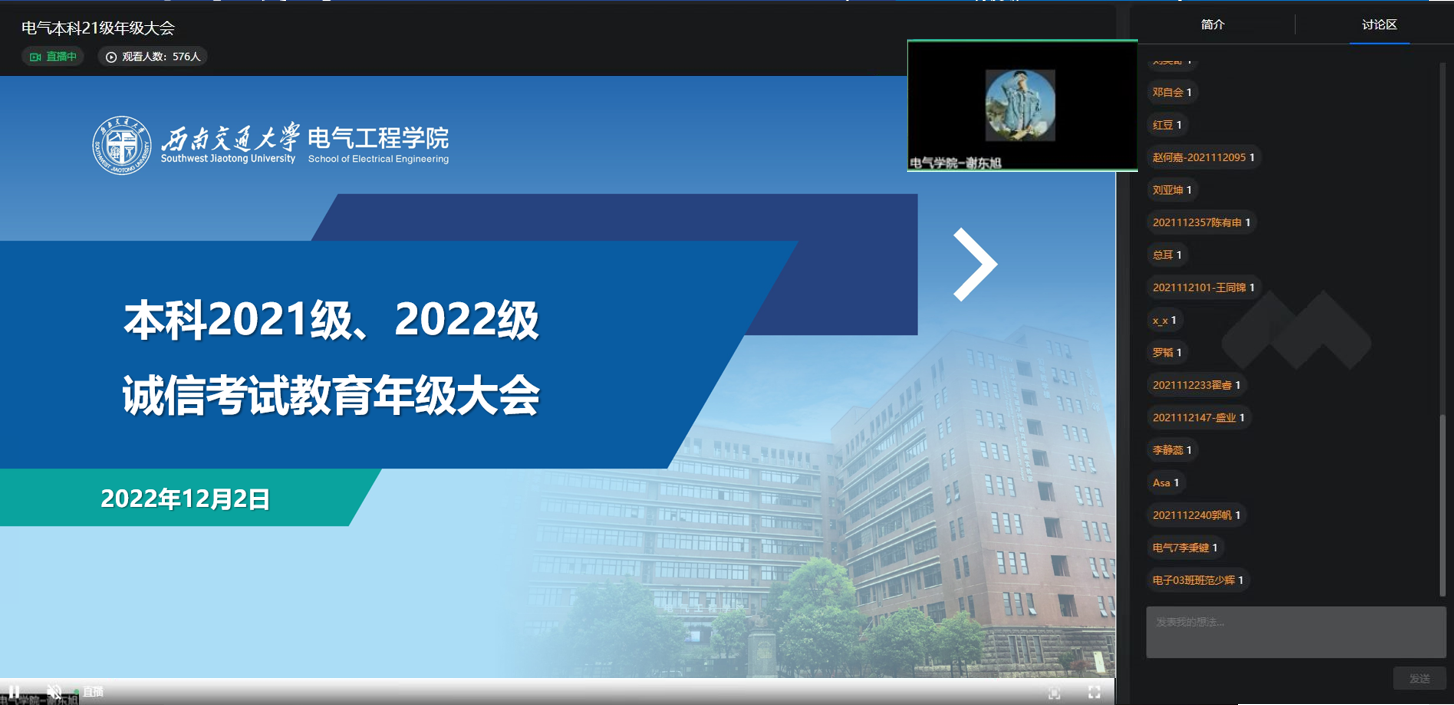为保证电气本科21级、22级全体同学期末考试顺利进行,学院于2022年12月2日晚7点召开本学期期末年级大会暨期末诚信考试教育会。根据《西南交通大学关于做好近期教学工作安排的通知》,学院已有部分同学申请了“自愿返乡学习”,为保证会议的效果,本次会议采用了线上进行的方式,本科21级、22级全体同学及辅导员参加。