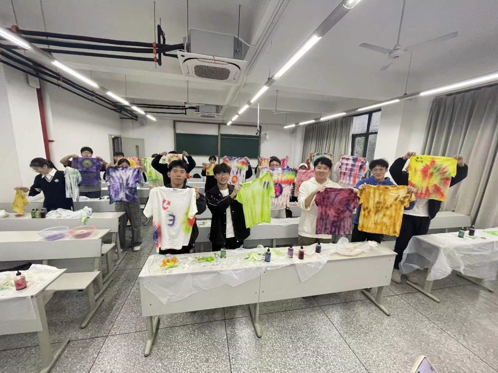 在实操中,大家互相学习,共同讨论,对自己的作品有大致的构思和想法后,一步步动手,完成了自己的第一件作品,大家在这个过程中享受了扎染的快乐但也体会到非遗作品的难度!随后同学们对自己的作品进行二次加工,也有同学直接开始自己的后续作品创作。
