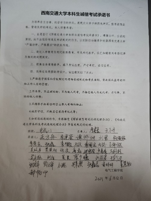 期末考试将至,为动员同学认真准备期末考试,同时开展考试纪律教育和违规警示教育,进一步强化考风考纪教育,2023年6月8日电气学院本科2022级在犀浦校区图书馆一号报告厅、二号报告厅召开期末动员会——暨诚信考试教育大会,本科2022级全体同学及辅导员参与会议,会议由占祥文、孙海洋主持。
