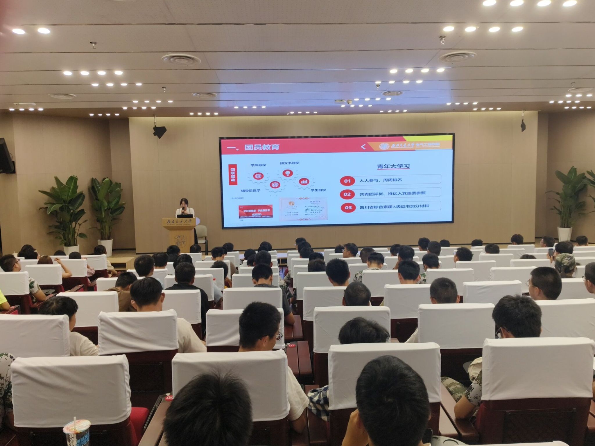 2023年9月16日晚上19:00,电气工程学院本科2023级在西南交通大学犀浦校区一号报告厅开展共青团基础团务专题讲座。此次讲座由辅导员郭冰倩老师主讲,电气学院本科2023级辅导员詹睿、罗霁轩和全体新生参与。