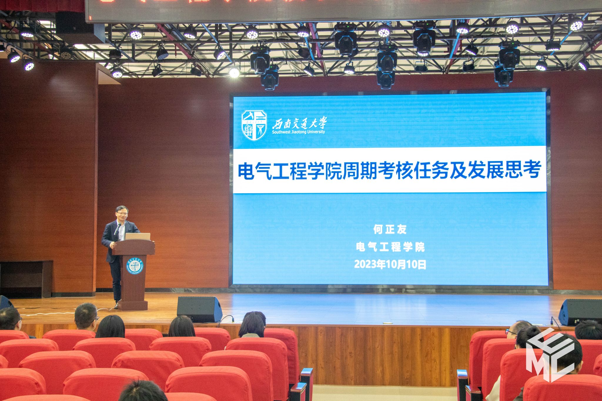 首先, 何正友院长以《电气工程学院周期考核任务及发展思考》为题,从新一轮周期考核任务、学院发展成绩、周期目标差距分析等方面对学院的未来发展进行深度分析。何正友院长强调,人才、平台、行业是学院发展中三大互相耦合的决定性因素,在未来,学院要持续巩固轨道交通行业地位,积极响应国家战略,竭力拓展行业领域,将学院发展推向新高度。
