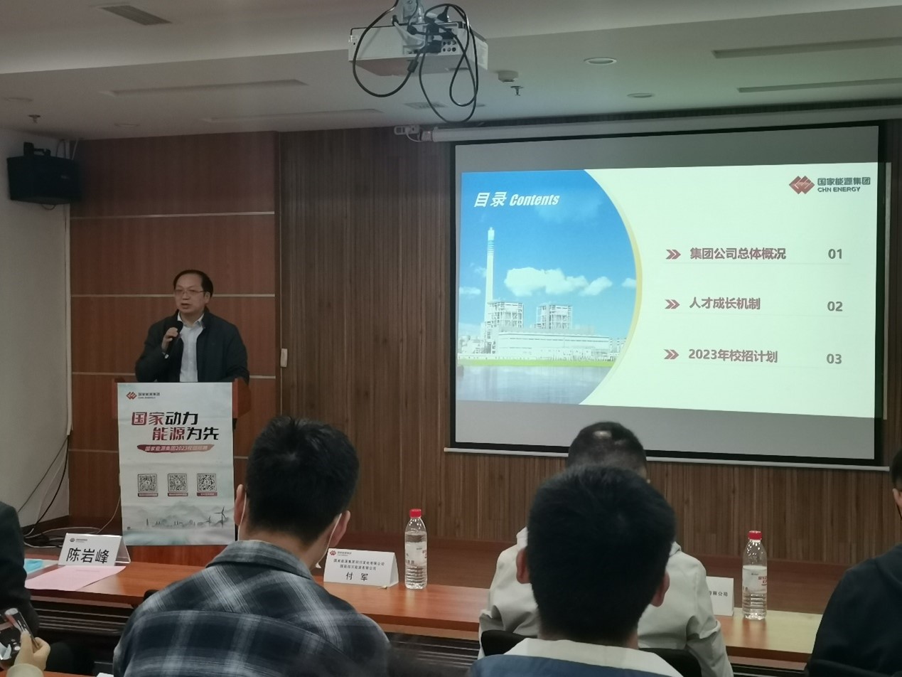 紧接着,国能集团下属子公司:国能黄骅港务有限责任公司、国能包神铁路集团有限责任公司和国能集团四川发电有限公司的负责人分别进行宣讲。负责人从公司情况、招聘岗位及流程等方面为同学们阐述了招聘要求。其中,国能集团四川发电有限公司的负责人通过视频展示了公司在四川高温保供攻坚战中做出的贡献,呼吁各位同学加入公司成为一名光荣的“发电人”。