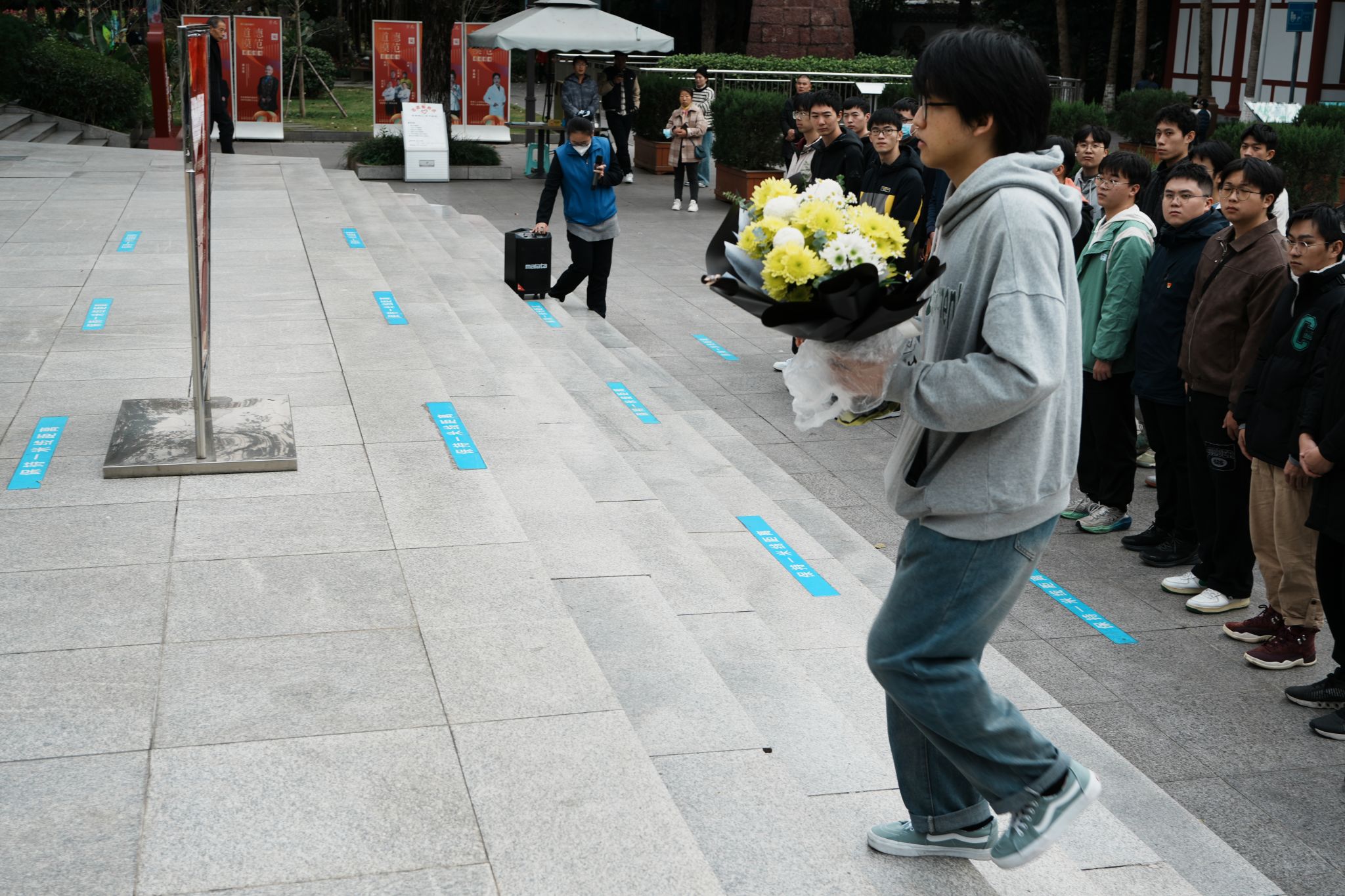 听完烈士英勇事迹讲述后,大家在烈士的墓碑前,庄严肃立,向着革命烈士们的纪念浮雕默哀。默哀结束后,党员代表向前敬献鲜花,深切缅怀革命先烈的丰功伟绩,向革命先烈致以崇高的敬意。