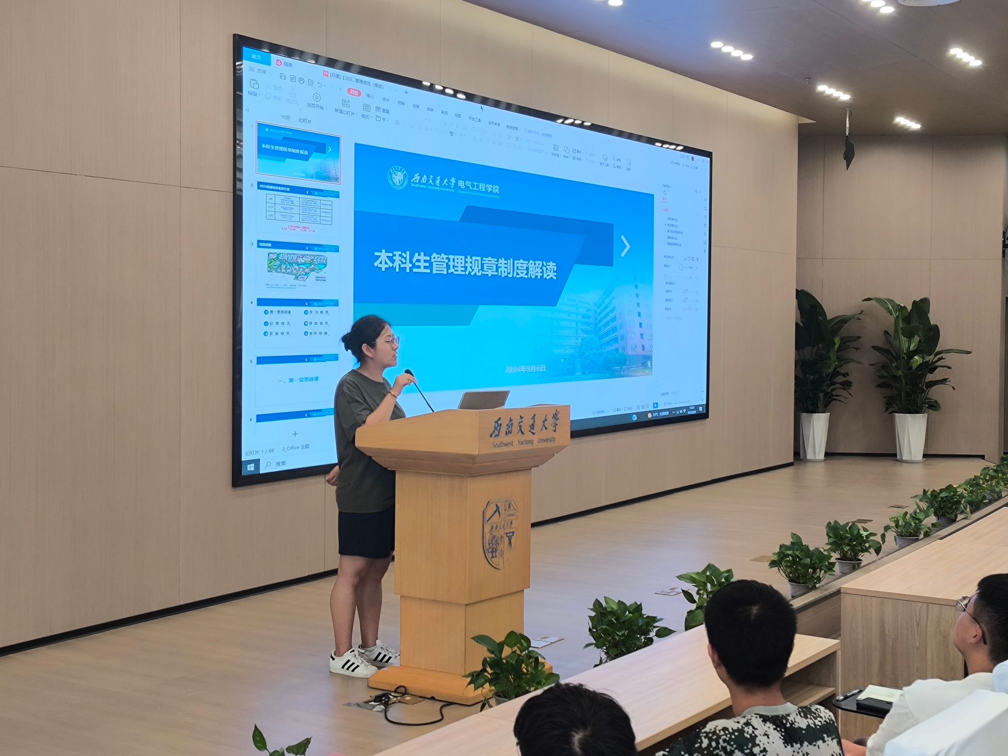 2024年9月6日下午15时,电气工程学院本科2024级在图书馆一号、二号报告厅组织新生学习西南交通大学本科生相关管理规章制度。学院本科2024级辅导员赵娜、杨之溢、艾效天,新生辅导员助理与本科2024级全体新生共同参加会议。本次规章制度解读由杨之溢老师和艾效天老师主讲。