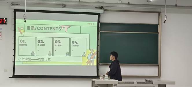 两位同学先用一份简洁而清晰的思维导图将同学们引入线代的世界,并展示他们独特而又高效的学习思路与方法,详细讲解线性代数的核心概念与解题技巧。石熙贝同学针对矩阵计算、向量空间与线性变化等重难点进行深入浅出的剖析,分享她遇到的挑战与解决方法,鼓励同学们保持耐心与毅力,逐步克服学习中的困难。蒋艺同学强调了线性代数对后续专业课程的重要性,通过一些生动的实例,向同学们展示线代在解决实际问题中的应用,激发同学们的学习兴趣!