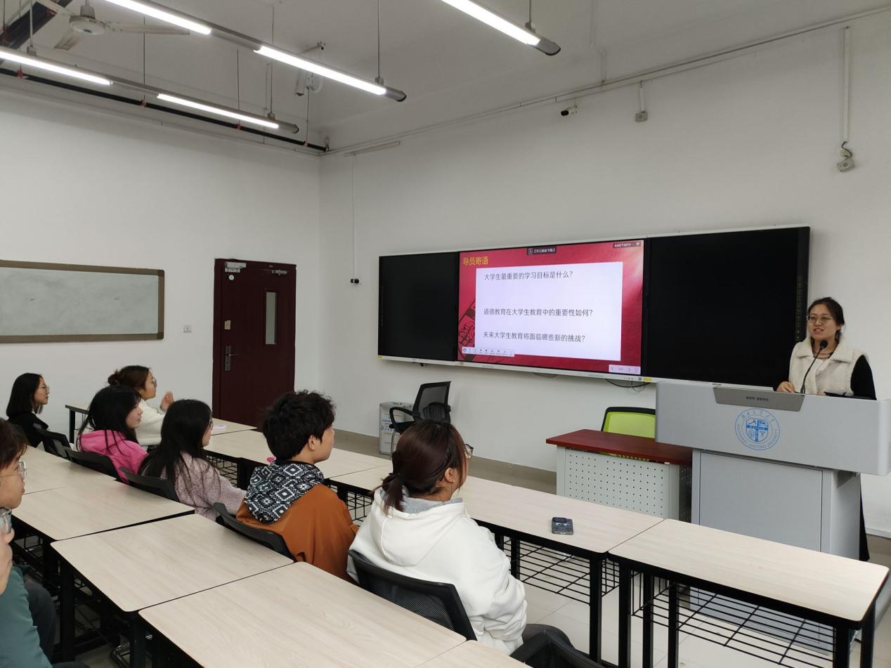 最后,赵娜老师回应同学们关于大学阶段如何学习的问题。首先,应当树立正确的学习目标:努力成长为德智体美劳全面发展的时代新人。大学是获取知识渠道最丰富、自我发展机会最多的阶段,同学们应精研专业、广泛涉猎,构建多元知识体系。其次,应当认识到德育的重要性。道德教育是教育的基础和根本,同学们应明晰自己的身份和角色,从我做起,既充实自己又培养集体责任感。最后,面对新时代新挑战,赵娜老师希望同学们能够提高服务国家服务人民的社会责任感、培养用于探索的创新精神和善于解决问题的实践能力,成长为德智体美劳全面发展的时代新人。