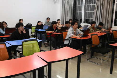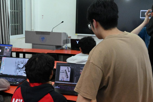 随后,在宣传部副部长范圣杰的讲解下,全体同学系统学习了PS软件的操作界面与核心功能。通过现场投屏演示,重点讲解了: 图层管理技巧(分组、蒙版、混合模式)、常用工具组应用(选框、画笔、文字工具)、图像调整功能(曲线、色阶、色彩平衡)和特效应用(颜色叠加、内发光、颜色渐变)等PS软件常用操作。讲解结束后,宣传部成员也为同学们提出的操作问题进行解决和指导。