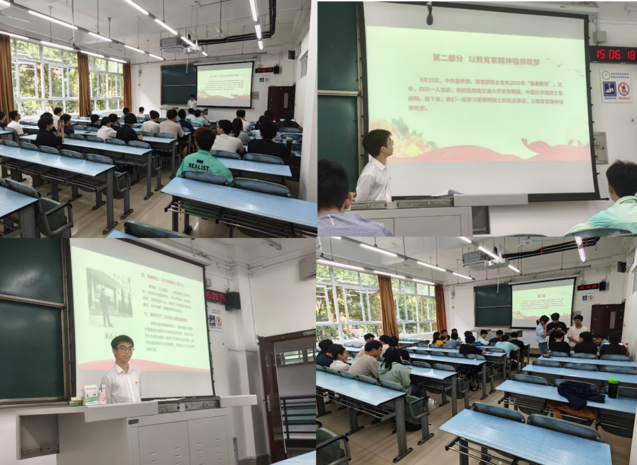 2025年9月18日,西南交通大学电气本科2023级党支部在X2227教室组织开展“以伟大抗战精神固本铸魂,以教育家精神扬帆筑梦”主题党日活动。活动结合中国人民抗日战争暨世界反法西斯战争胜利80周年纪念节点与教师节契机,引导学生党员深刻感悟伟大抗战精神、学习教育家先进典范,进一步强化使命担当意识。