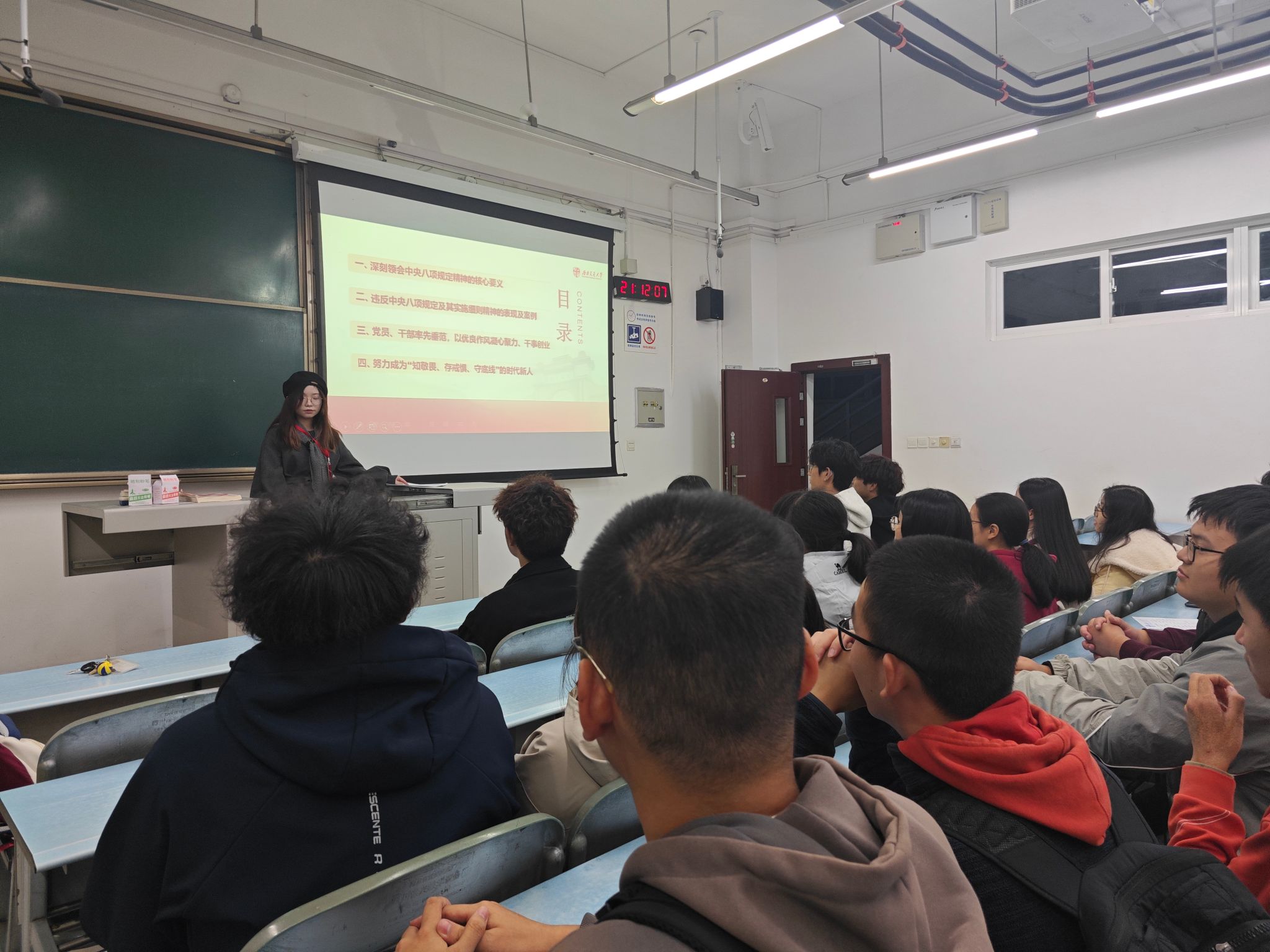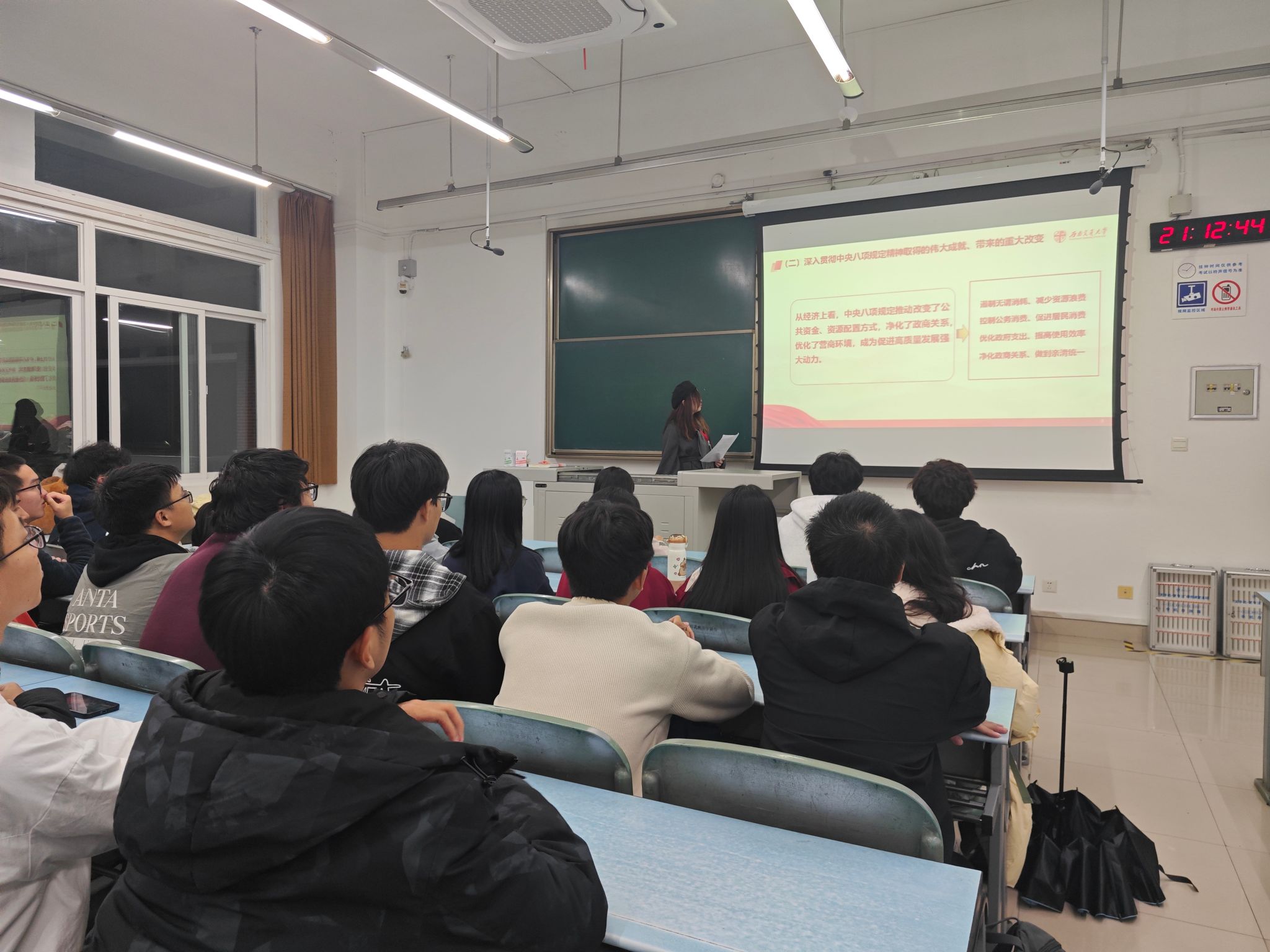 主讲人综合部部长张颖津同学从学生干部履职视角出发,将贯彻中央八项规定精神理解为“务实办活动、规范用经费、真诚待同学”三个具体方向,避免空泛解读,以学生会过往工作案例为切入点,让作风建设要求更易理解。她提到,学院学生会承办的活动众多,一定要规范使用经费,杜绝浪费和滥用,这是“厉行节约、务实为民”的精神在学生工作中的具体体现,我们不是“不花钱”,而是“把钱花在同学们需要的地方”。