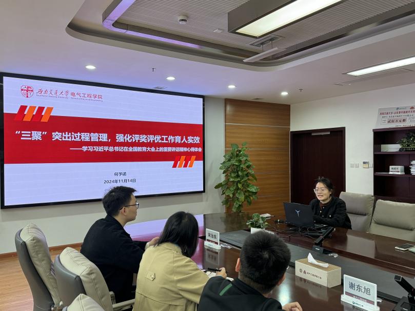 为深入学习贯彻习近平总书记重要讲话和全国教育大会精神,推动党中央关于建设教育强国的重大决策部署落实落地,进一步凝聚学生工作队伍思想共识、强化使命担当、激发学习热情,2024年11月14日上午,电气工程学院学生工作组在电气馆X10212开展第二次集中学习贯彻全国教育大会精神暨学生工作专题会议。学校党委学生工作部副部长谢力、学院党委副书记邢晓鹏及学院辅导员参加会议。本次会议由邢晓鹏副书记主持。