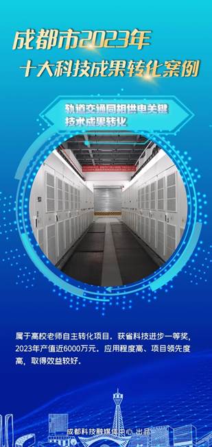2024年3月14日,在成都市中试平台服务供需对接暨科技成果转化十大榜单发布会上,成都市2023年十大科技成果转化案例正式揭晓,电气工程学院共两项科技成果入选,分别是“荣创新能氢能源燃料电池产业化项目”和“轨道交通同相供电关键技术成果转化”。
