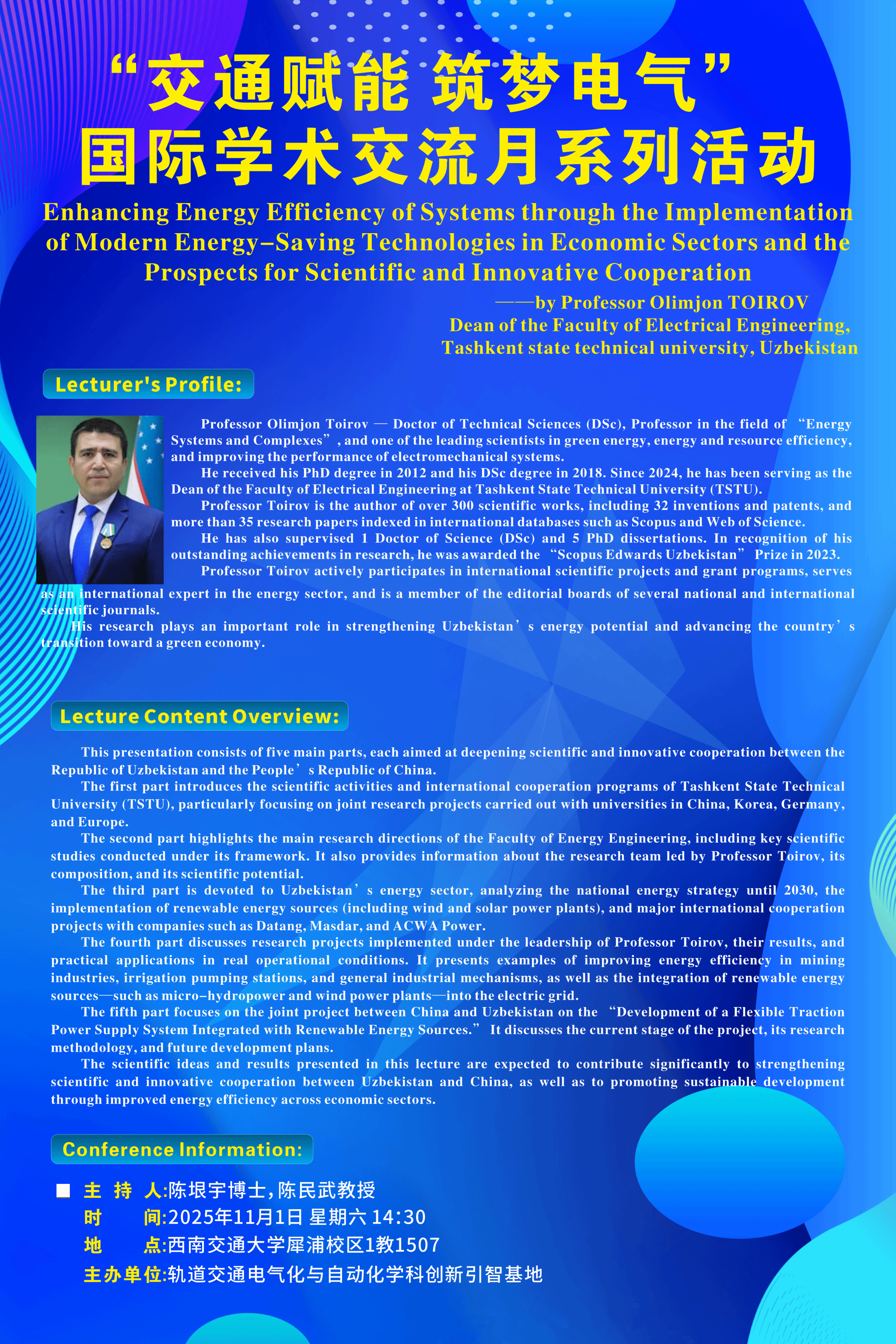 “交通赋能 筑梦电气”国际学术交流活动 Enhancing Energy Efficiency of Systems through the Implementation of Modern Energy-Saving Technologies in Economic Sectors and the Prospects for Scientific and Innovative Cooperation