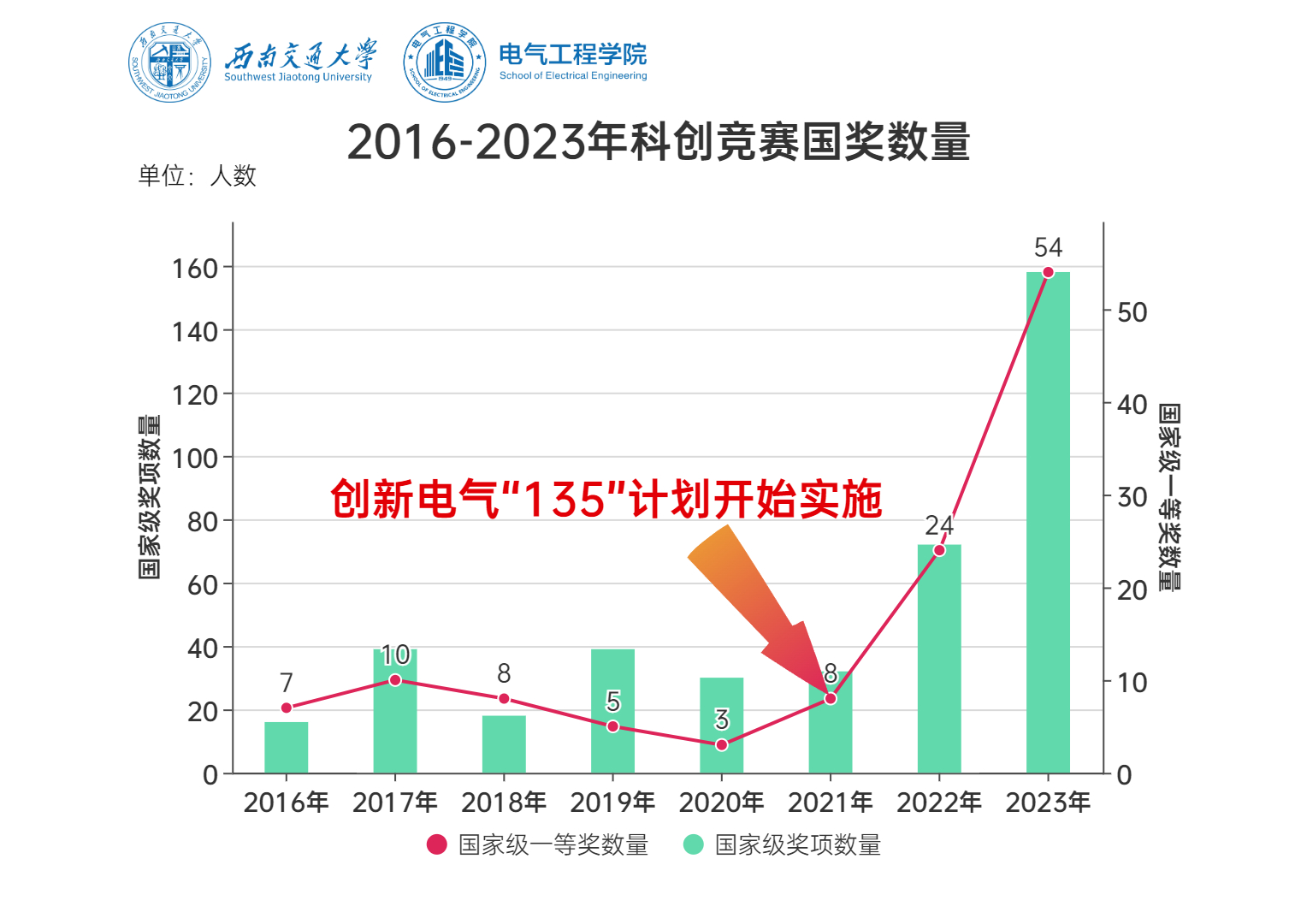 2023年6月-8月,全国A类学科竞赛相继开展全国总决赛,电气学院师生奔赴全国各地,在国赛现场过关斩将,勇夺佳绩:我院2023年A类学科竞赛共斩获国家级一等奖22项(全校共60项)、54人次,二等奖30项(全校共79项)、49人次,三等奖35项(全校共105项)、55人次,省部级奖项获奖人数达295人次,国一获奖数量、省部级奖项以上获奖总数量位居全校第一,创学院科创竞赛历史最好成绩!