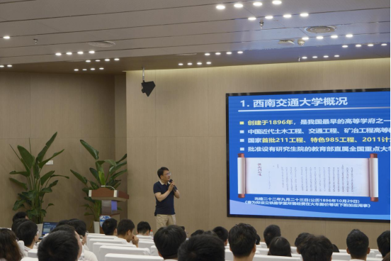 院长助理黄德青教授作报告。黄德青教授首先向同学们介绍了自己的求学历程,分享了自己的人生格言。随后阐述了选择西南交通大学电气工程学院的八个理由,希望同学们来到西南交通大学电气工程学院攻读研究生。最后,黄德青教授寄语同学们能够万事如愿,当遇到挫折时,一定要坚强勇敢。
