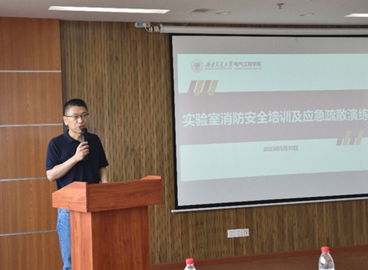 为带动师生关注实验室安全,加强自我防范意识,营造实验室安全文化氛围,电气工程学院于2023年5月30日下午在犀浦校区电气馆10832开展实验室安全培训及应急演练活动。资产与实验管理处副处长闻毓民、科长王舒涵、赵春花,保卫处副处长朱云峰、科长吴小平,科研院张英蓉老师、张化雨老师,校长办公室王竣锋老师;电气工程学院党委书记王斌、副书记谢力、副院长解绍锋、学院安全员刘仕兵,实验室教师及各实验室研究生参加本次活动。本次活动邀请到郫都消防大队彭雄做专业指导,同时还邀请了西南交通大学实验室安全大使团成员龚锦杰同学介绍学校实验室安全管理相关知识,活动由解绍锋副院长主持。