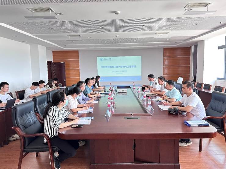 为加强两校之间的沟通与联系,推动文职人员遴选招聘工作,5月29日14时,海军工程大学电气工程学院一行到学院开展交流座谈。海军工程大学电气工程学院某教研室主任甄洪斌,课程团队负责人于飞、杨律,实验室张正康以及学院干事张佳栋;西南交通大学电气工程学院院长何正友、副院长陈民武、电力工程系副主任张血琴、电力电子与电力传动系副主任/《电机学》课程教师葛兴来、电力电子与电力传动系副主任王嵩、《电力电子技术》课程教师沙金、学生支持办公室主任张婷婷、教学秘书李砚玲参加会议。陈民武副院长主持会议。