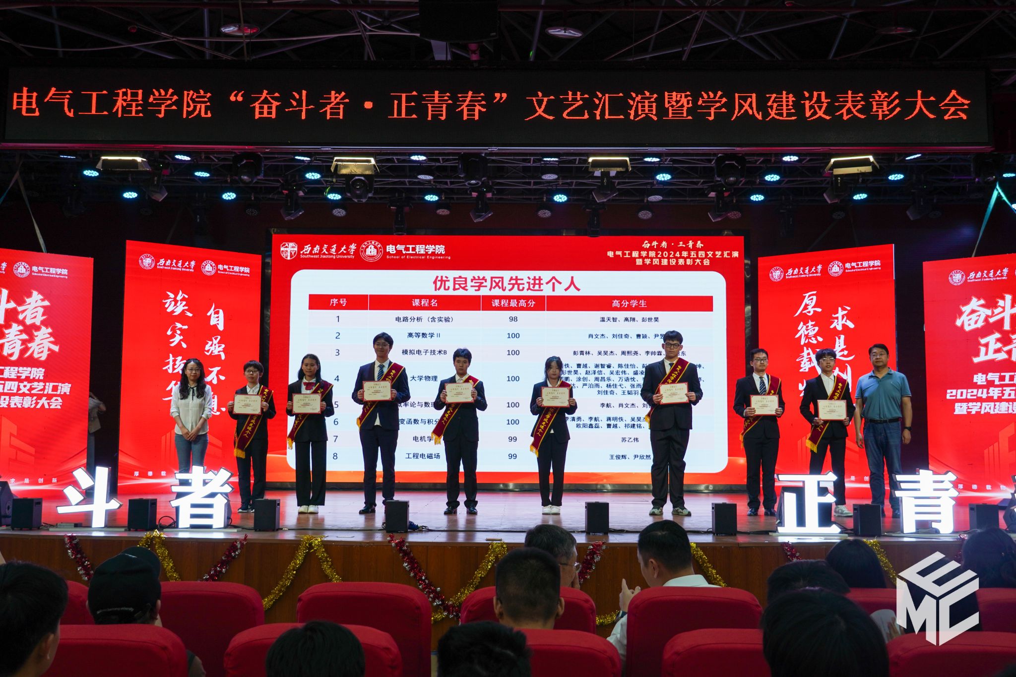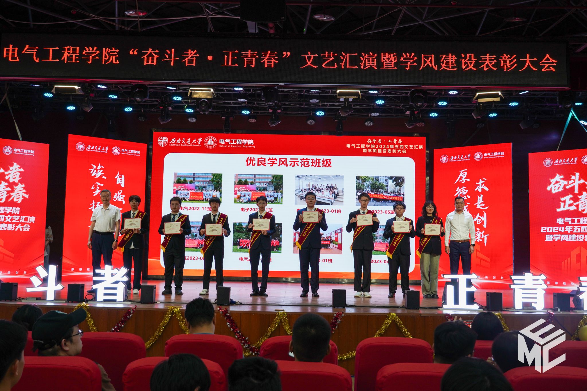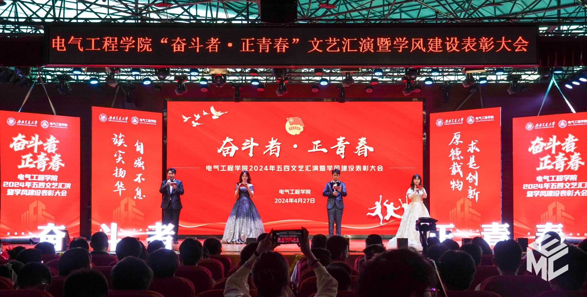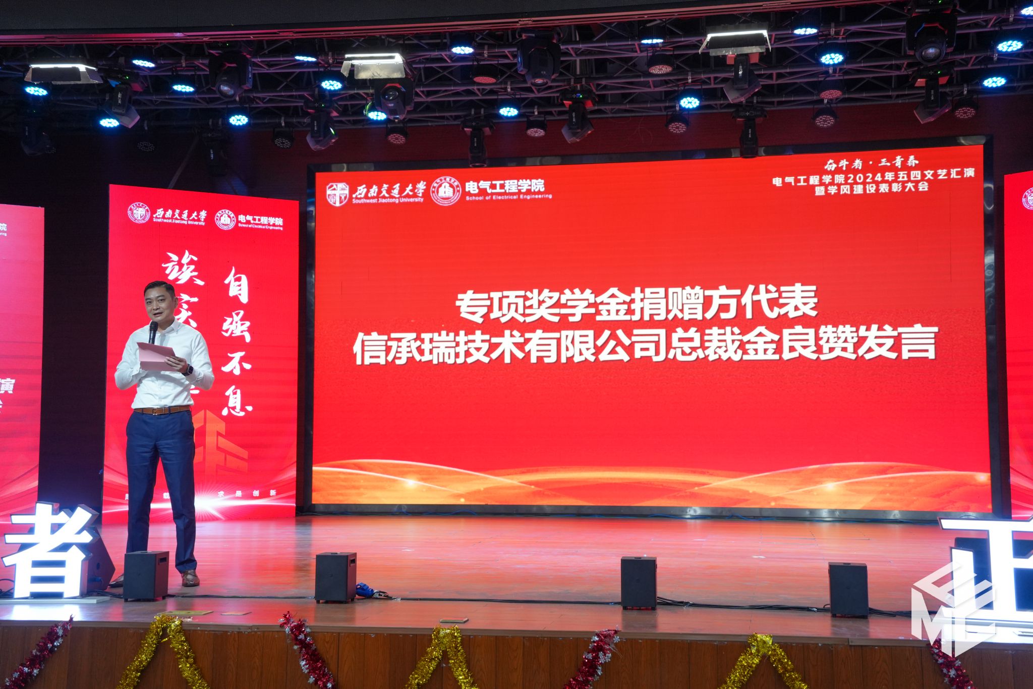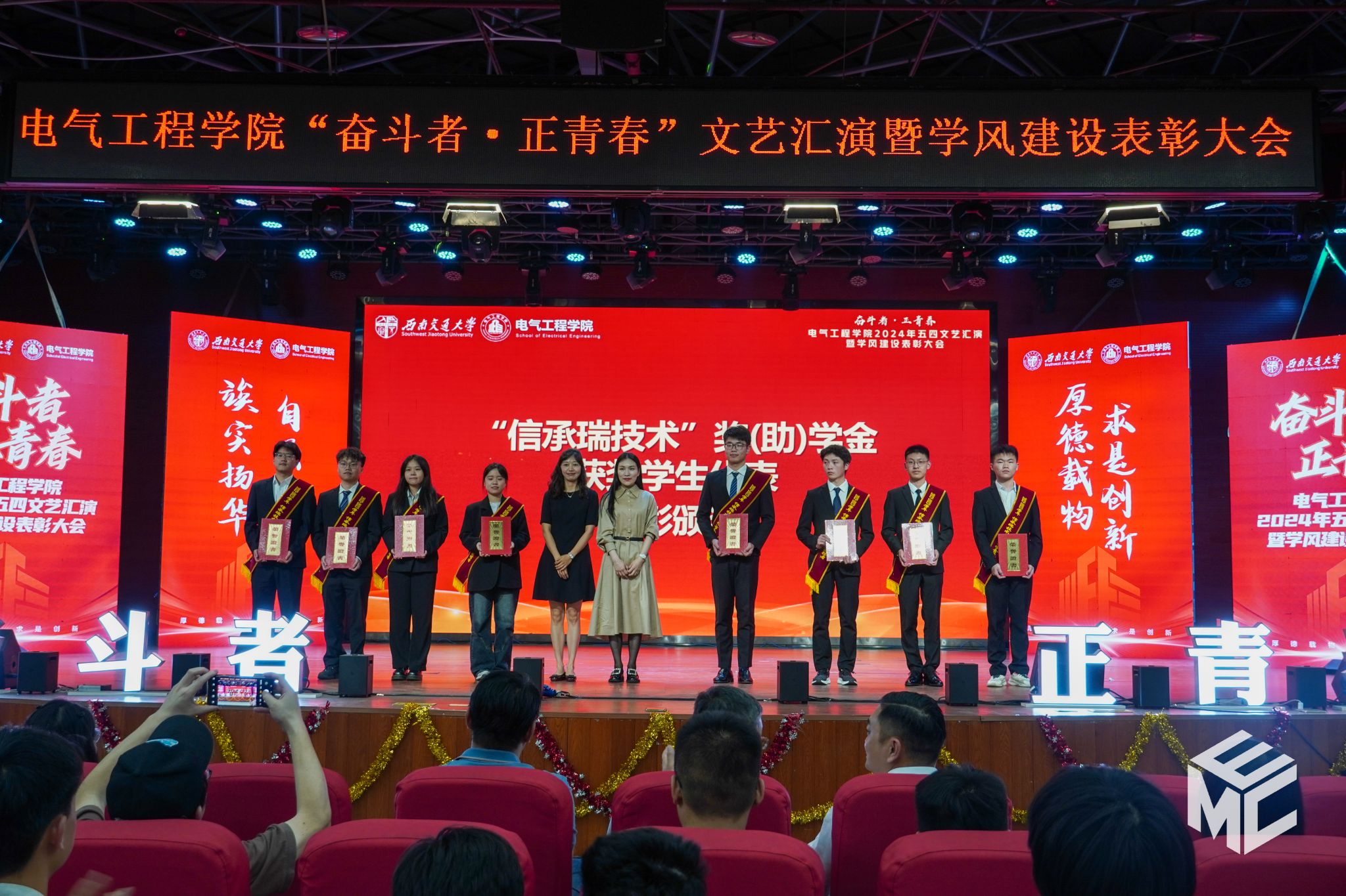2024年4月27日晚,电气工程学院“奋斗者•正青春”2024年五四文艺汇演暨学风建设表彰大会在犀浦校区大学生活动中心如期举行。西南交通大学团委书记武俊,党委学生工作部副部长邢晓鹏,教务处副处长刘鎏,招生就业处对外联络科科长董鹏飞,电气工程学院党委书记王斌,副院长解绍锋,学院党委副书记谢力、王轶,信承瑞技术有限公司总裁金良赞,信承瑞周钗妹千万光彩基金会理事长林婷婷等出席晚会。2023级班导师及全体辅导员与同学们齐聚一堂,共同参加本次文艺汇演暨表彰大会。