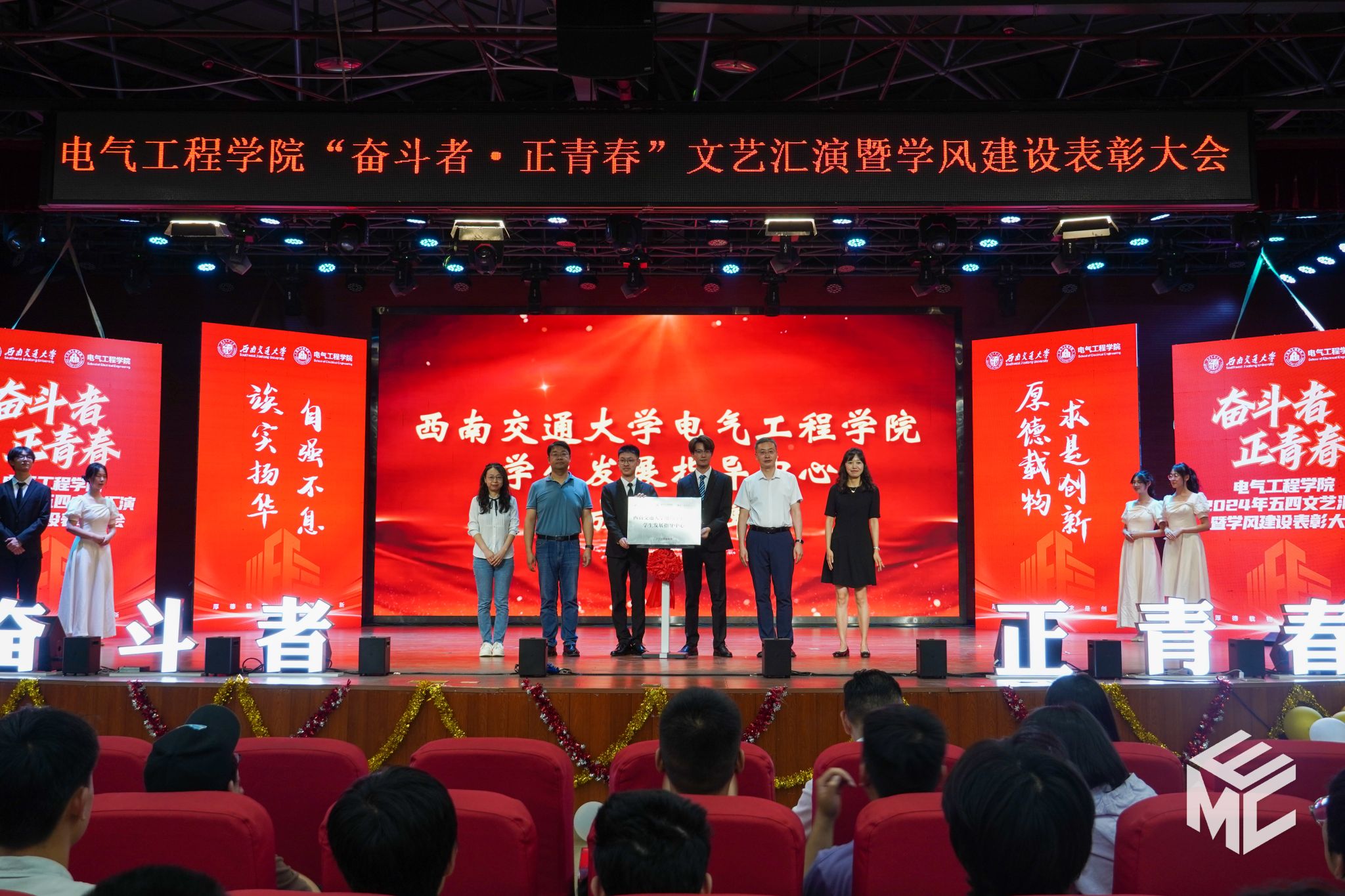 在本次文艺汇演暨学风建设表彰大会上,西南交通大学电气工程学院学生发展指导中心揭牌成立。