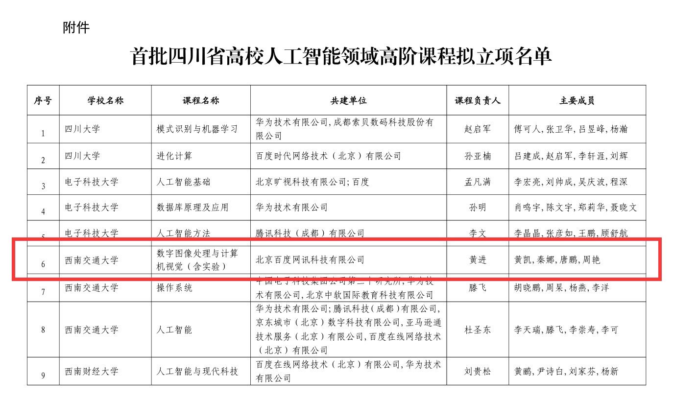 日前,四川省教育厅发布首批四川省高校人工智能领域高阶课程拟立项名单的公示,拟立项21门课程。电气工程学院教师黄进、黄凯、秦娜、唐鹏、周艳开设的“数字图像处理与计算机视觉(含实验)”课程入选该立项名单。