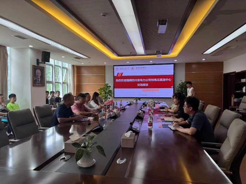 为进一步夯实高质量建设现代双一流人才根基,宣传特高压电网发展现状,高质量推进校企交流合作,6月12日上午,国网四川电力特高压直流中心一行到访学院开展交流座谈会。国网四川电力特高压直流中心主任、党委副书记文曹,党委组织部(人力资源部)主任朱业,宜宾直流运维分部副主任张鹏,党委组织部(人力资源部)人力资源管理高级师钟传玺,电气工程学院院长马光同、党委副书记谢力、团委书记张异、就业专项负责人樊芝菱、2025届本科生辅导员谢东旭共同参加会议。