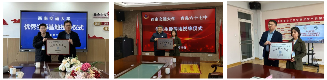 招生工作组代表西南交通大学分别与城阳二中、第六十七中学以及西海岸一中进行了优质生源基地授牌仪式,旨在加强高校与中学之间的联系,共同为学生搭建更为广阔的成长平台。