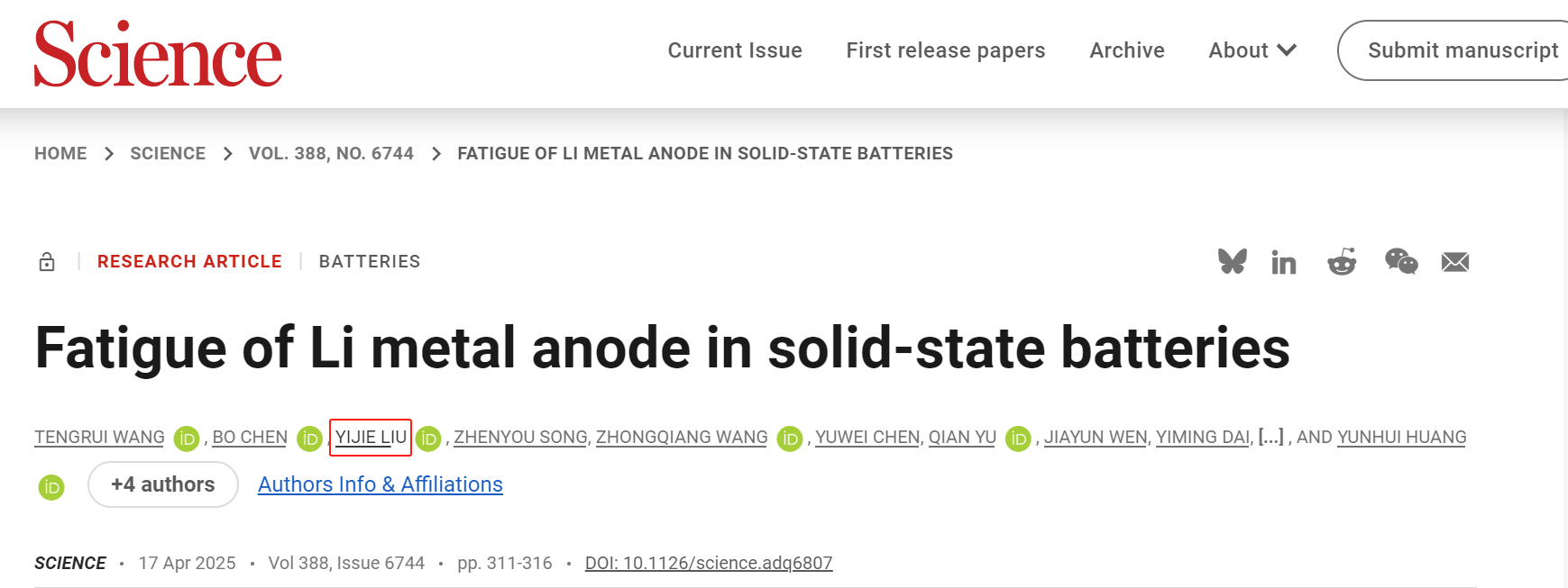 北京时间4月18日,国际顶级学术期刊Science在线发表了西南交通大学电气工程学院刘毅杰助理教授为共同第一作者的文章“Fatigue of Li metal anode in solid-state batteries”。该成果是电气工程、化学、材料、力学等多学科的深度交叉融合,由西南交通大学吴广宁教授团队、同济大学罗巍教授和华中科技大学黄云辉教授团队等合作完成。