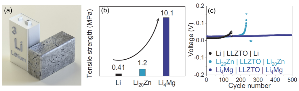 (b,c) 通过锂合金化增加疲劳强度改善固态锂电池循环稳定性